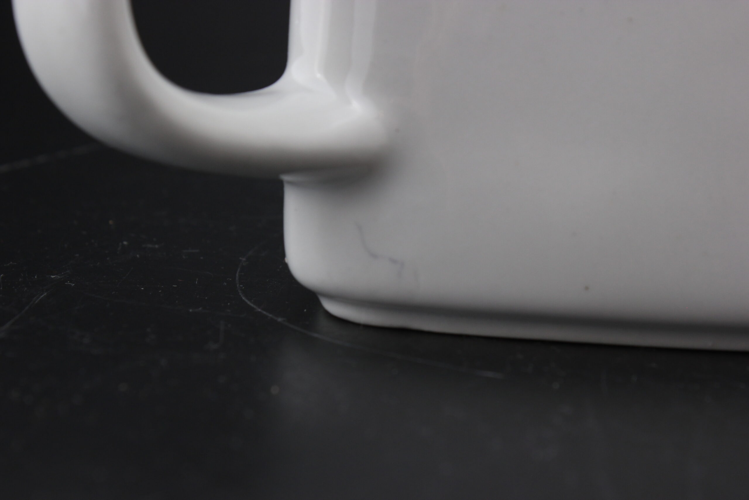 Kunto: yläreunassa pieni halkeama, käytön jälkiä, alakulmassa mustia jälkiä