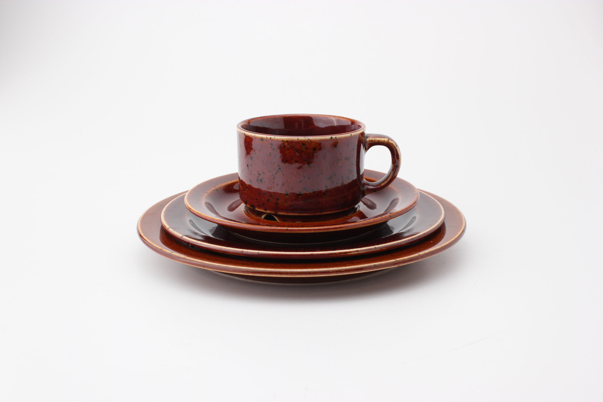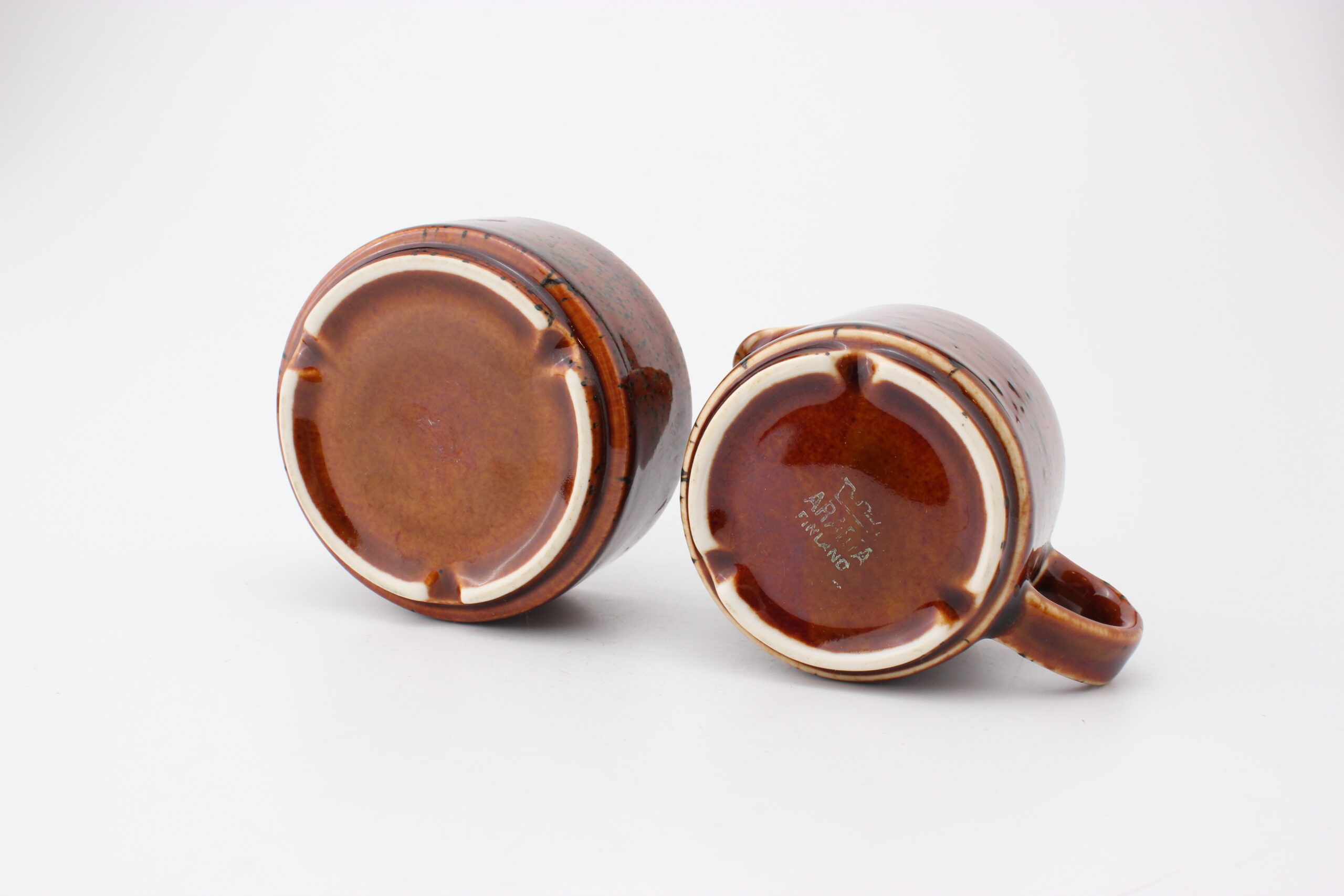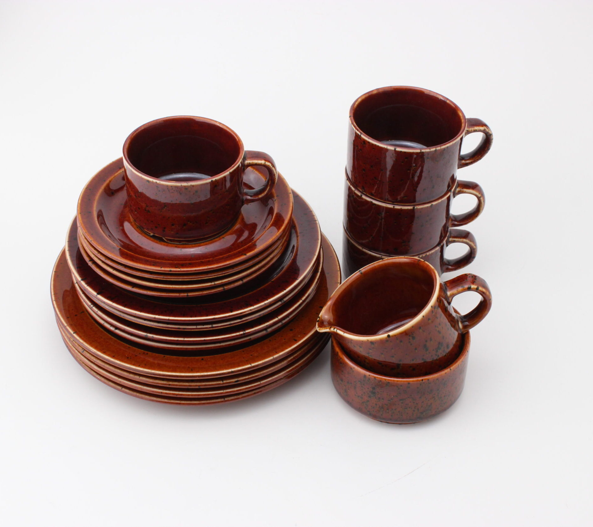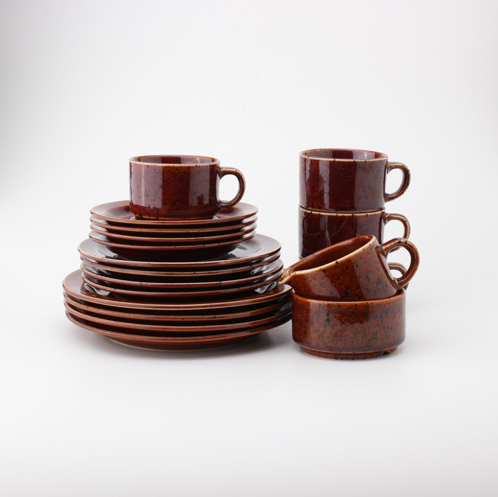Arabian valmistaman Krouvi astiaston 4 kahvikuppia, 4 asettia, 4 pullalautasta, 4 isompaa lautasta, 1 sokerikko ja 1 kermakko.