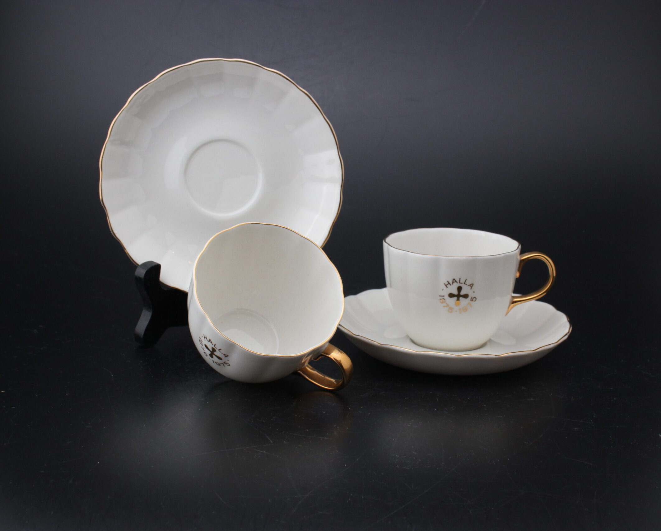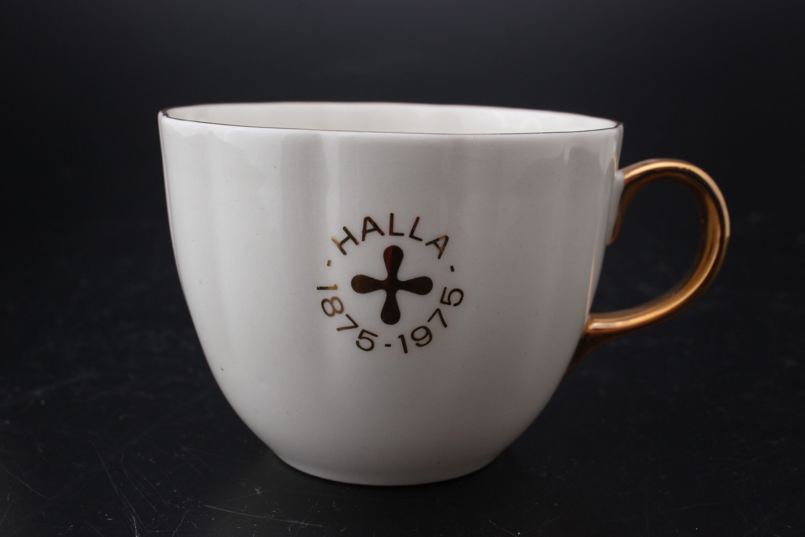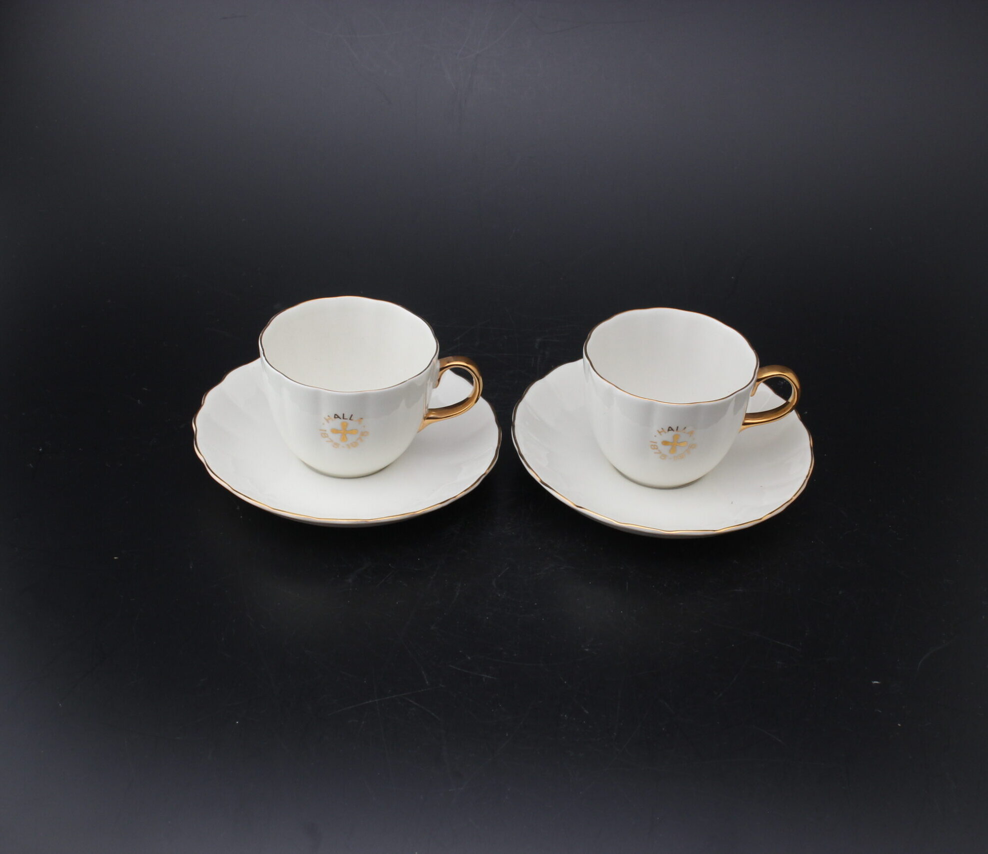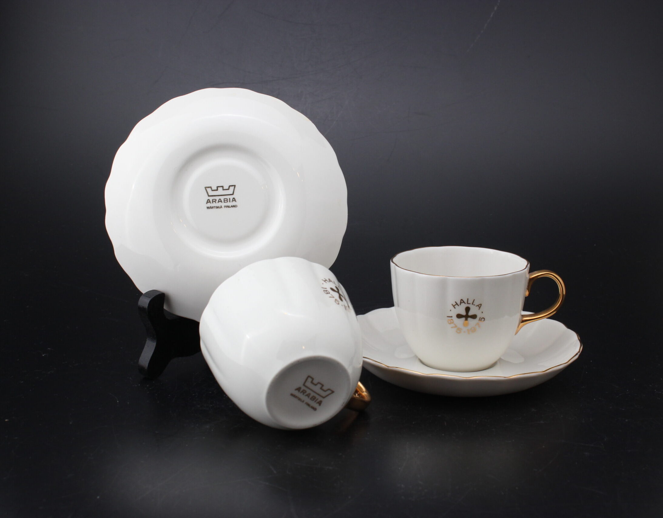 Huom: myydään kahden kupin ja kahden tassin settinä, valmistettu Hallan tehtaiden (Kotka) 100-vuotisjuhliin