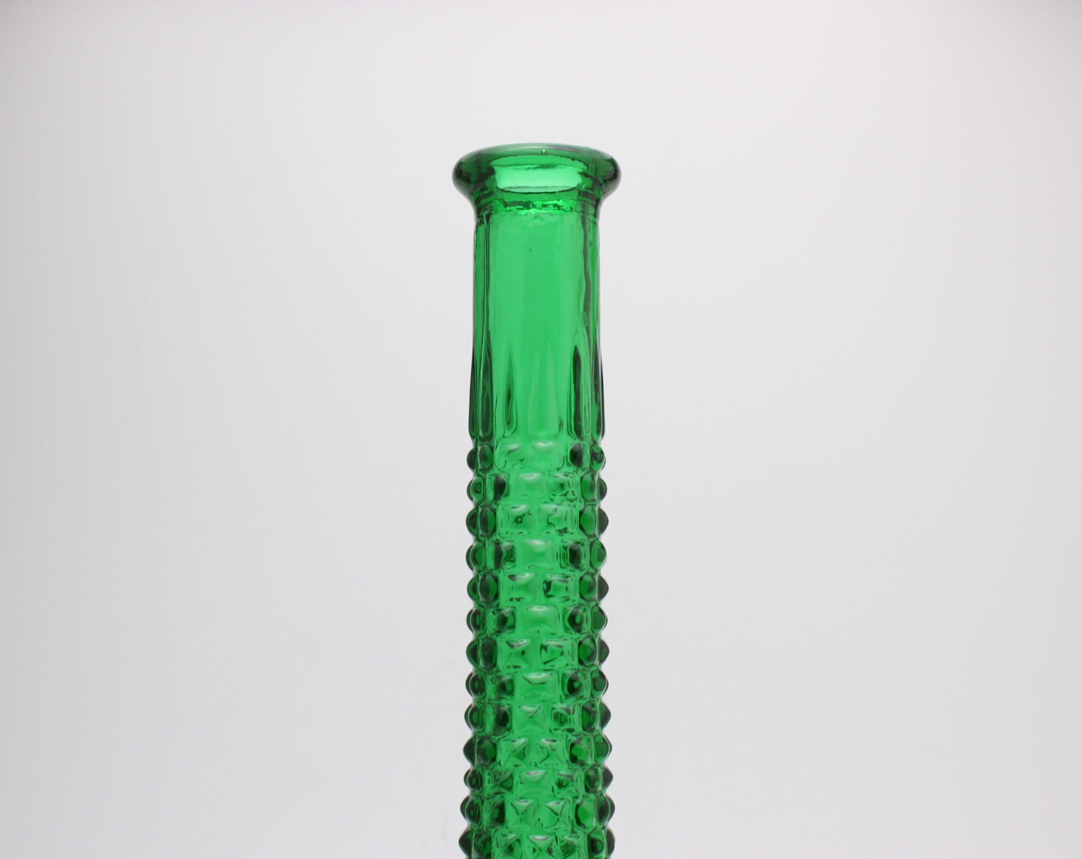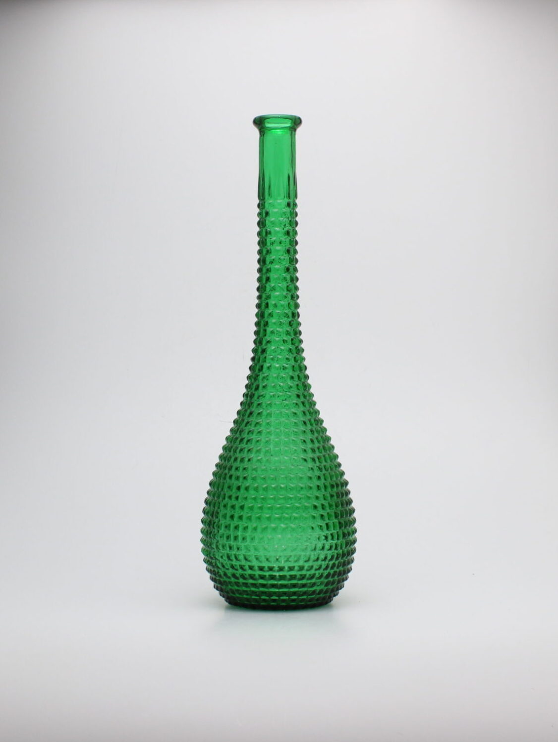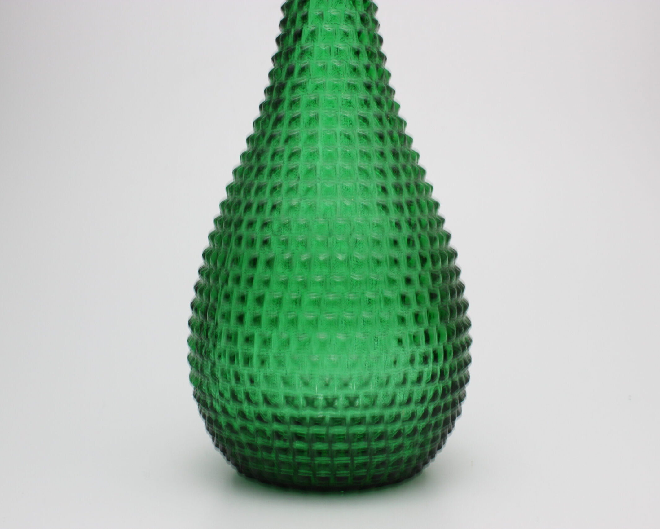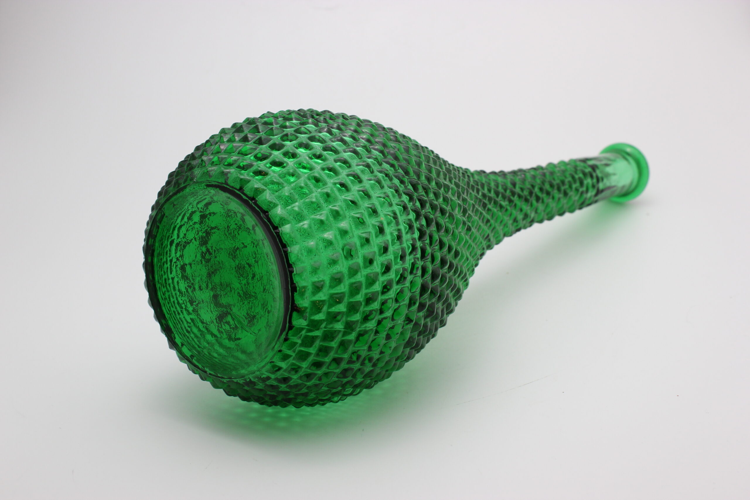 Empoli Glassworksin vihreä Genie pullo johon on porattu reikä alareunaan. Pulloa voi käyttää esimerkiksi lampunjalkana pujottamalla piuhan reijästä.