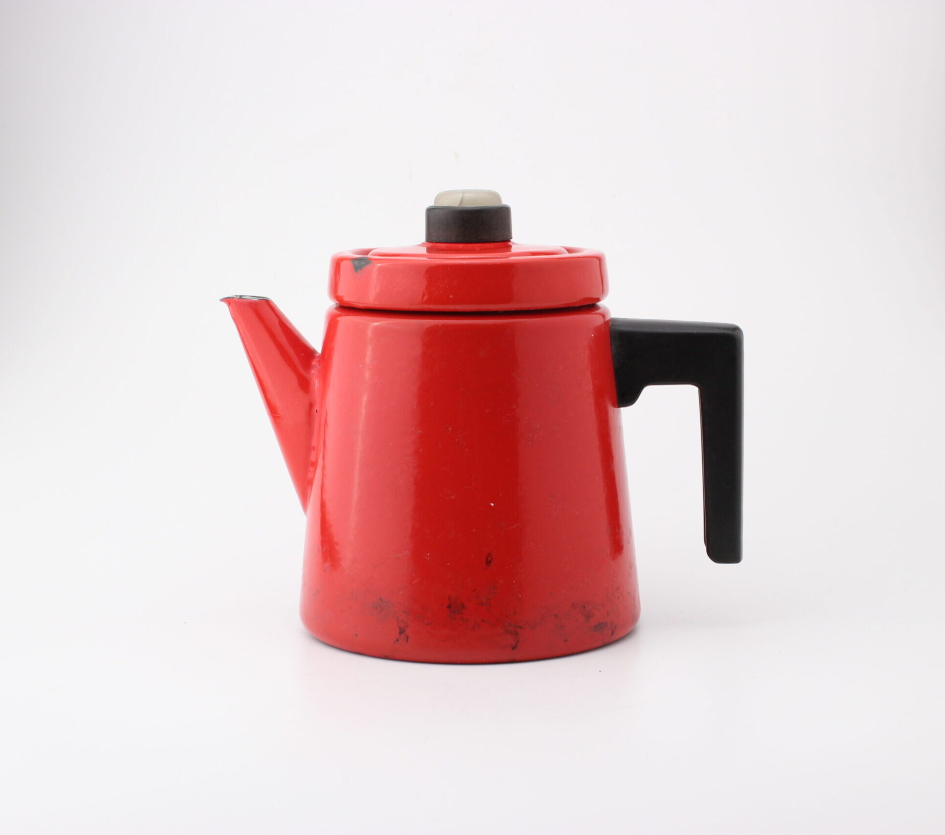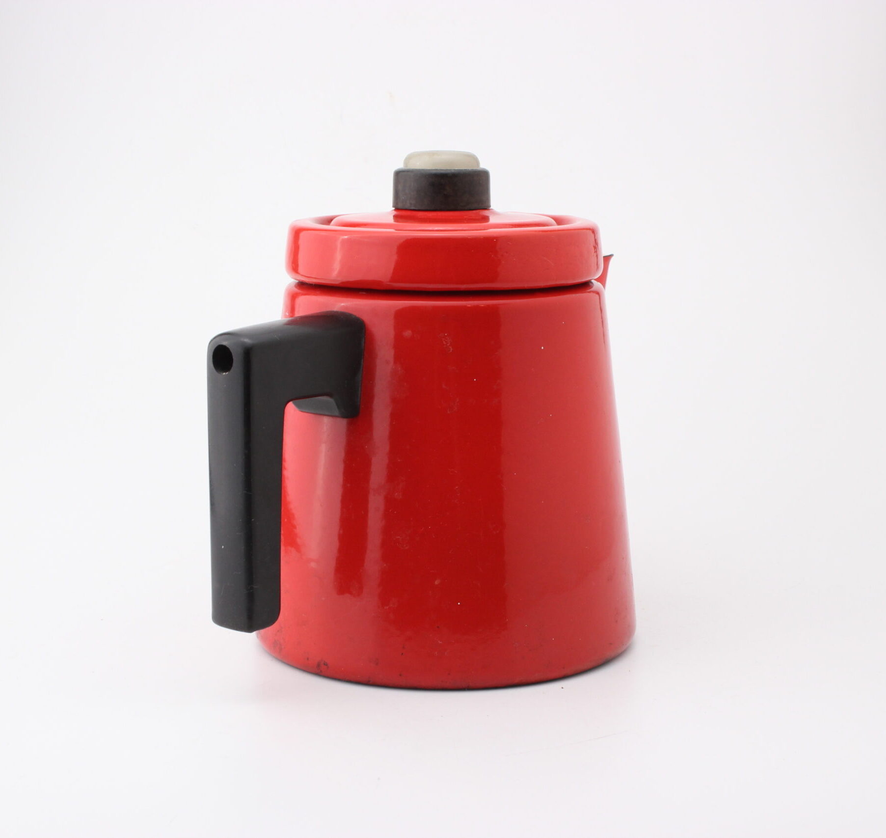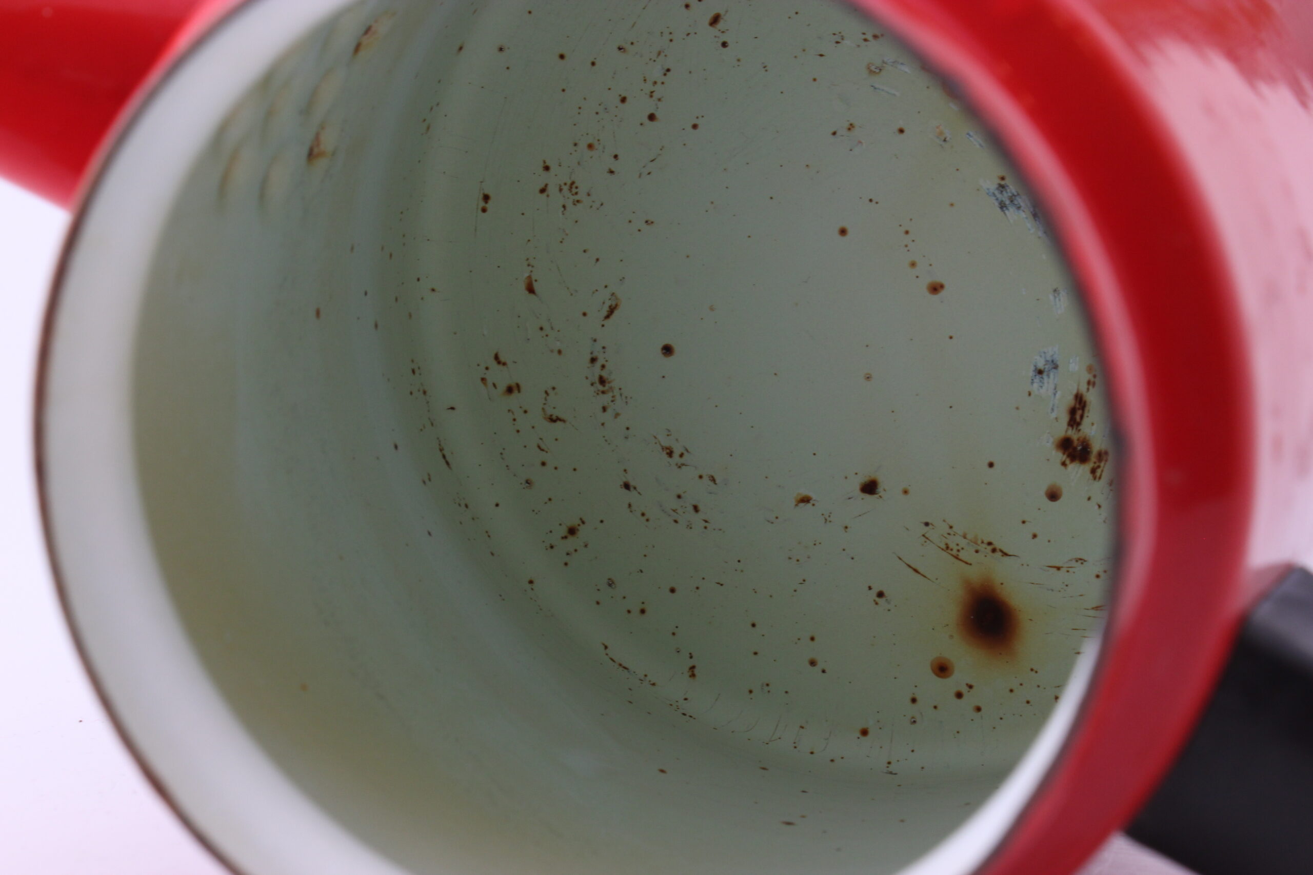 Kunto: ehjä, paljon käytön jälkiä, emali reunoista vaurioitunut, sisällä ruostetta ja isoja narmuja, kannessa emalivaurioita, tummentumaa