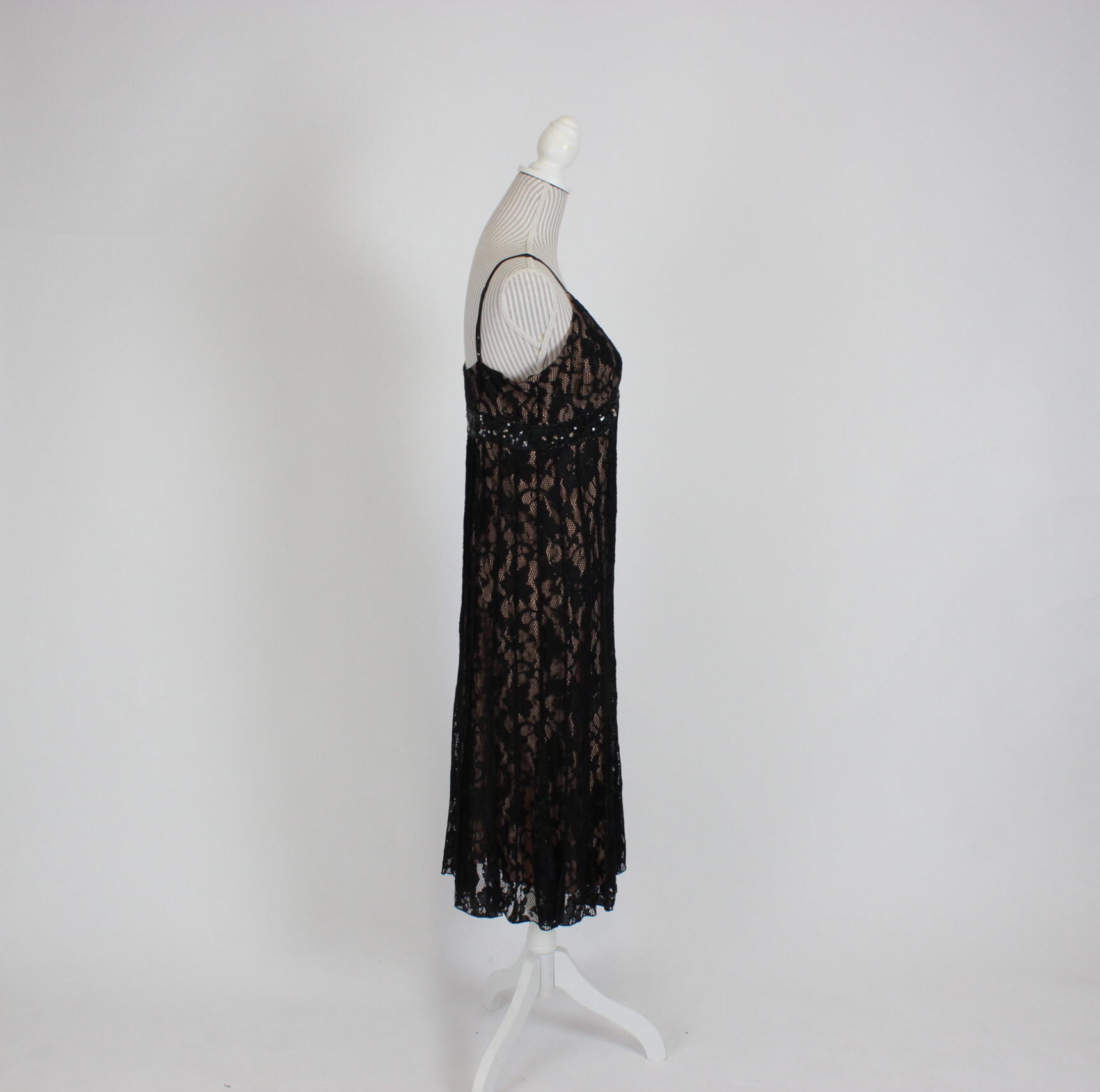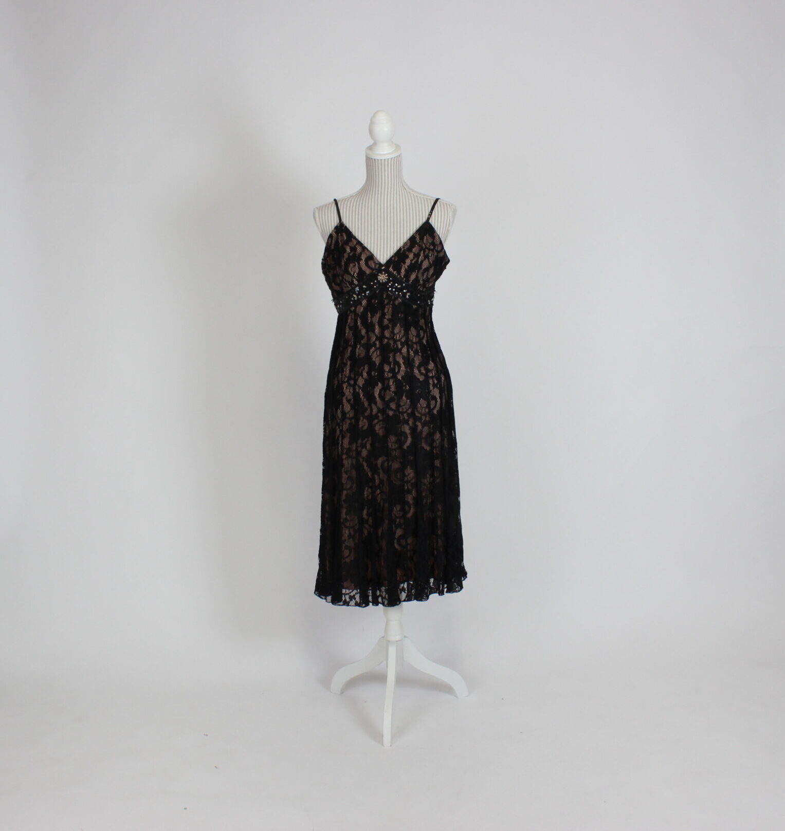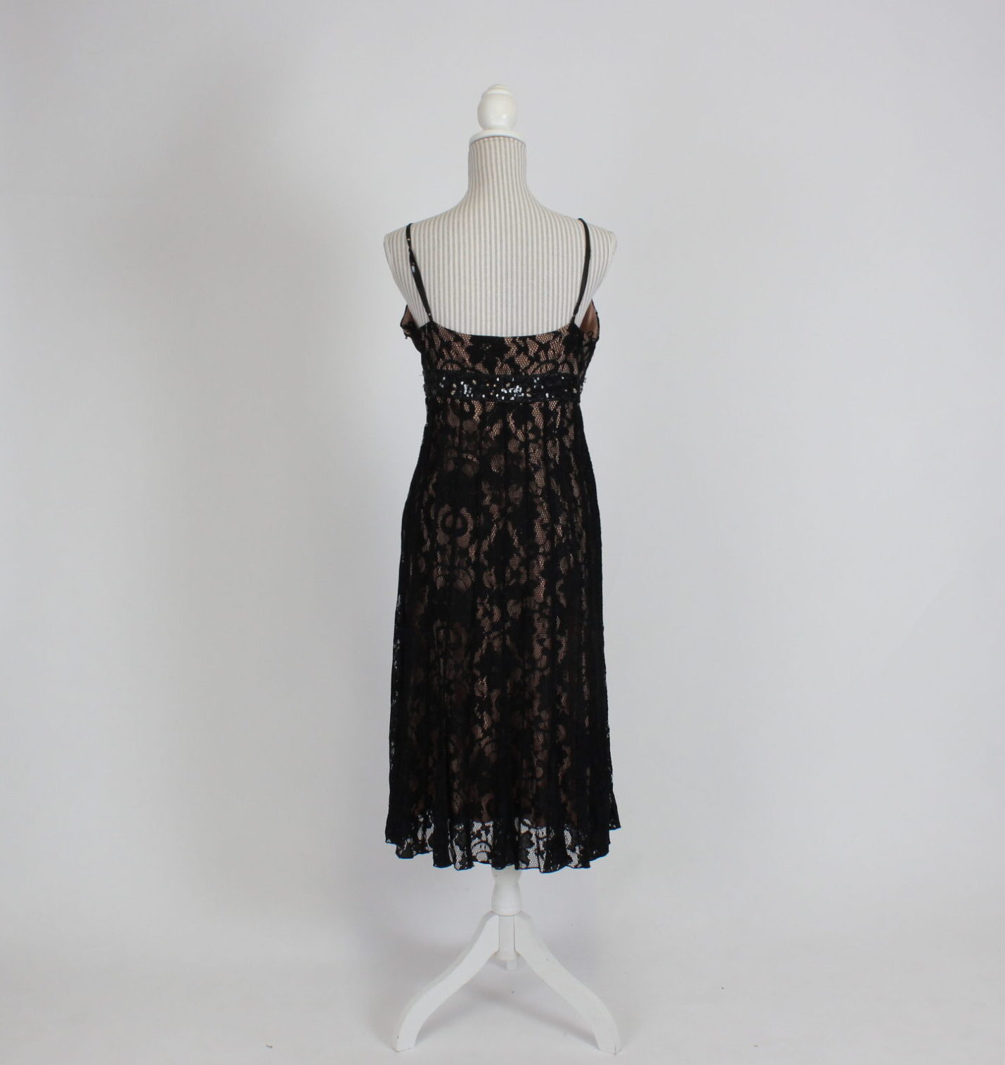 Gina Bacconin upea juhlamekko. Mekon pinta on mustaa pitsiä ja alempi kangas vaaleaa, luoden lähes läpinäkyvän efektin. Rinnalla paljetti koristelut.