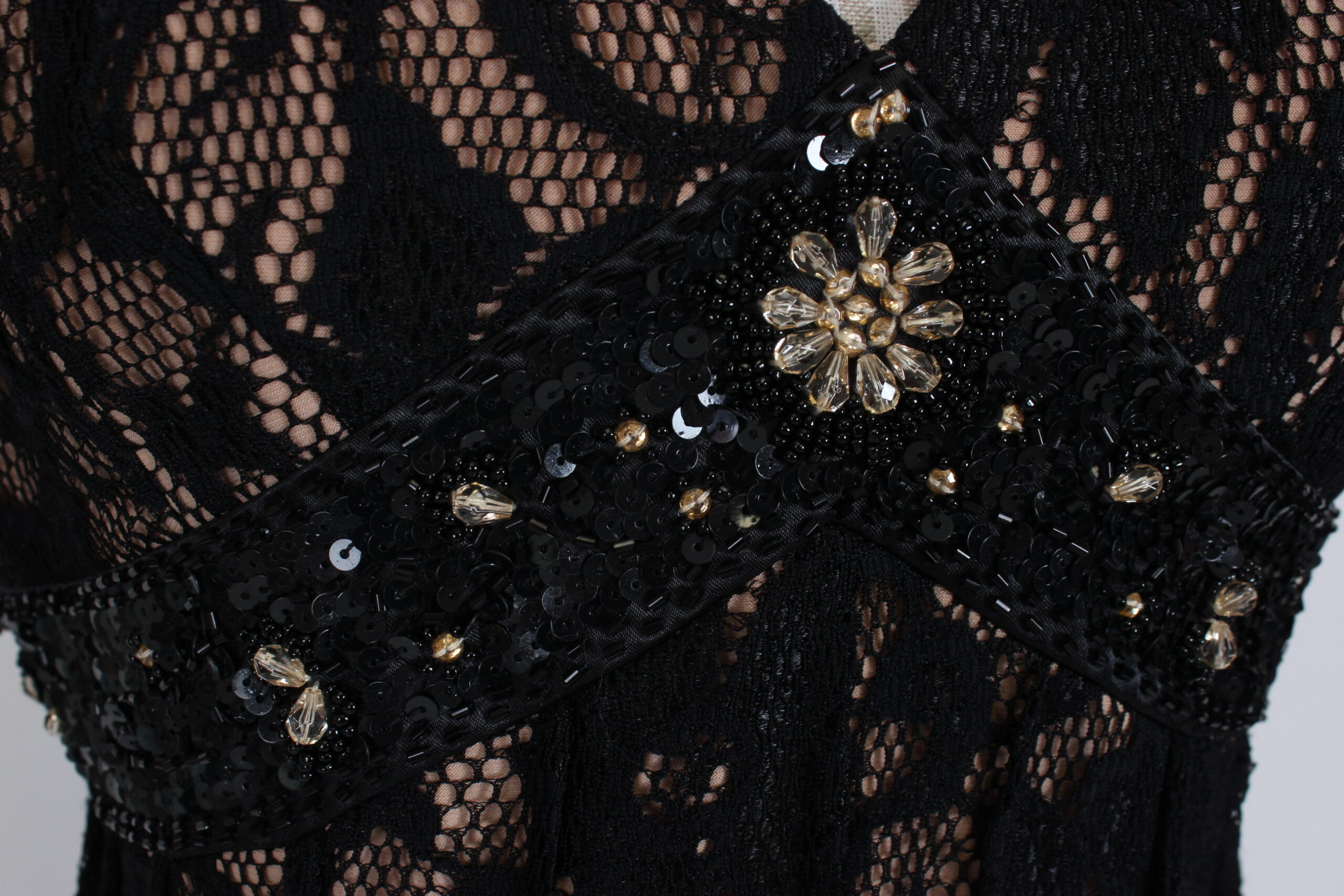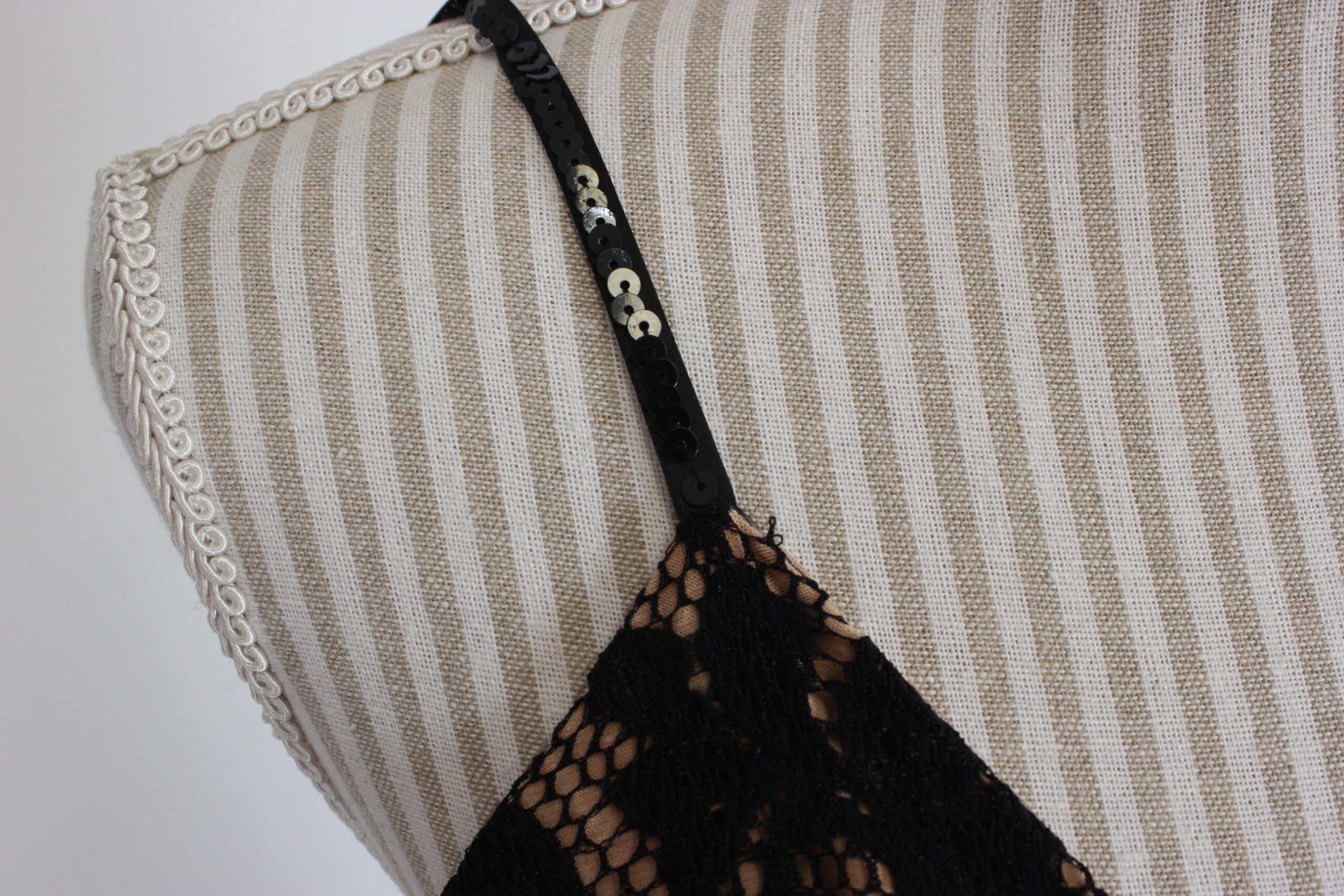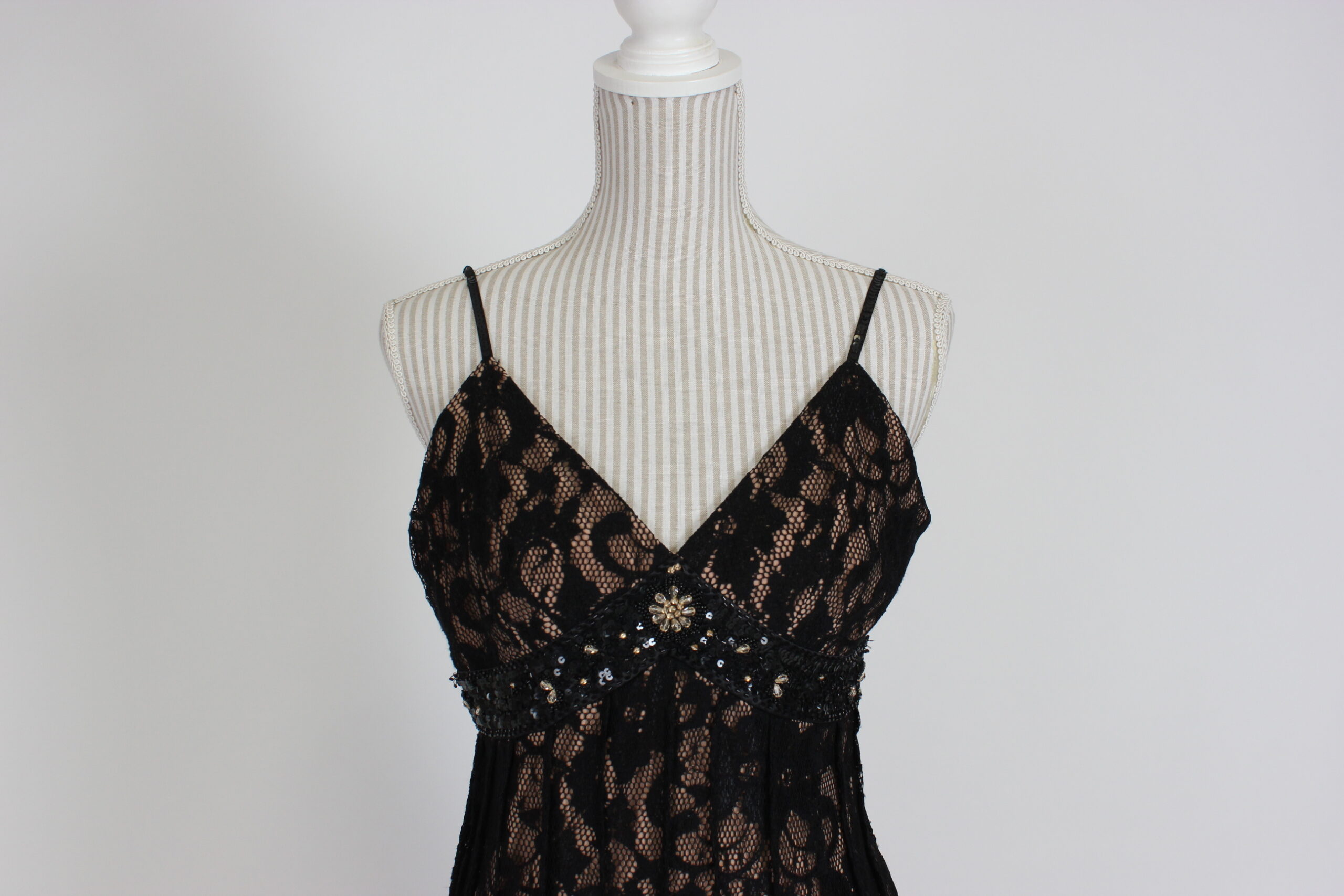 Gina Bacconin upea juhlamekko. Mekon pinta on mustaa pitsiä ja alempi kangas vaaleaa, luoden lähes läpinäkyvän efektin. Rinnalla paljetti koristelut.