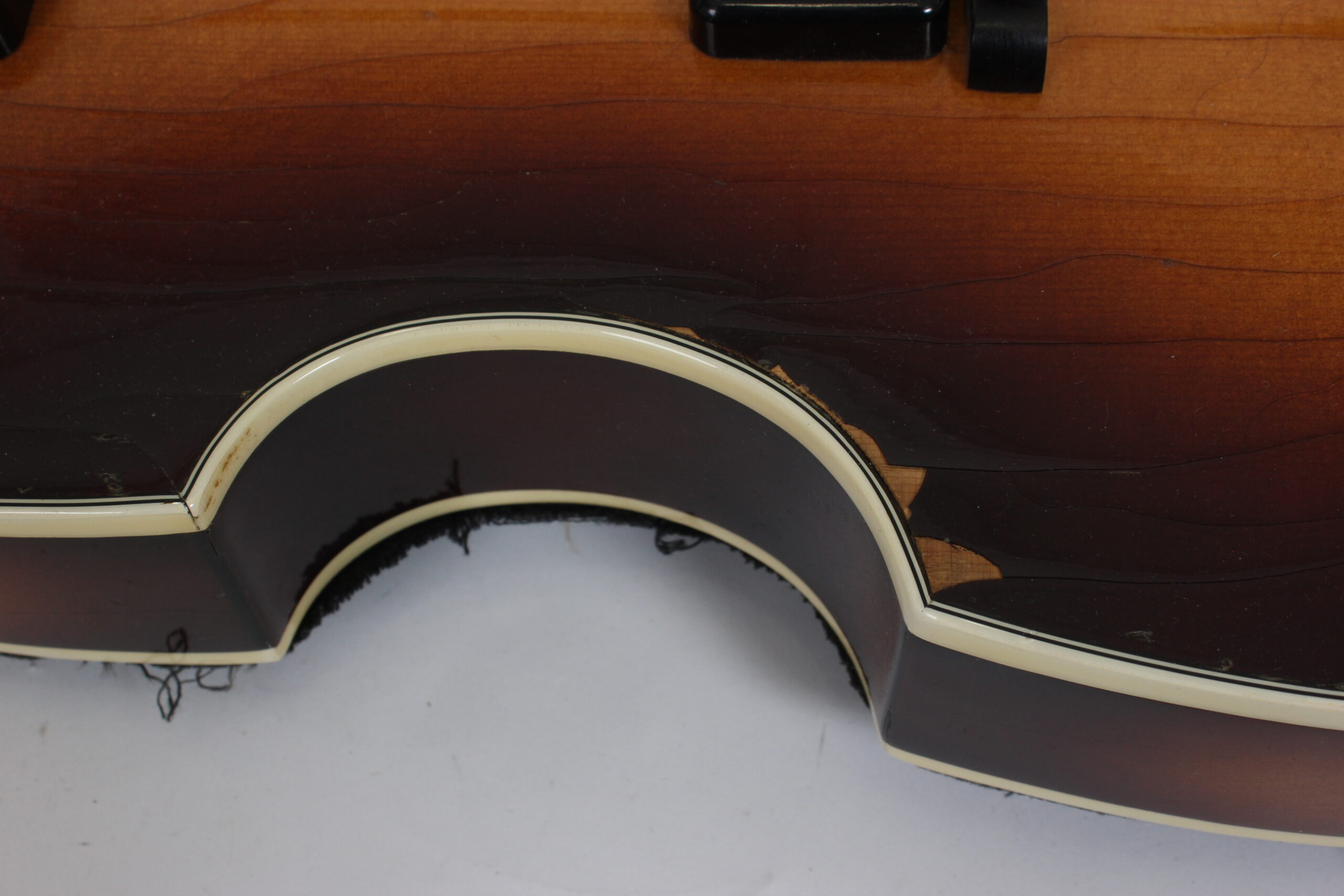 Kunto: testattu toimivaksi, lakkapinta lohkeillut, takakanteen liimattu samettikangasta, käytön jälkiä, likaa, kuljetuslaukussa paljon kulumaa