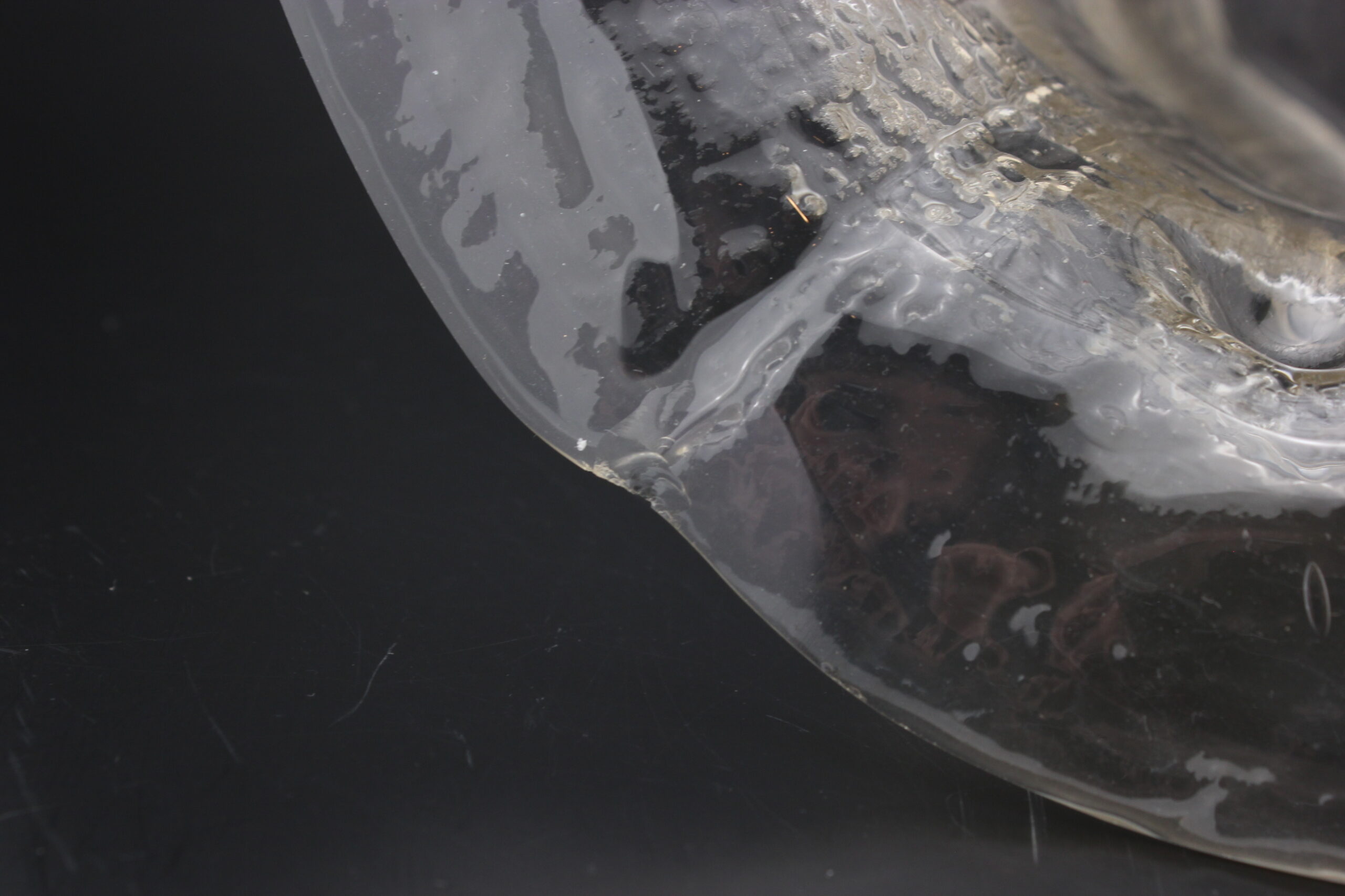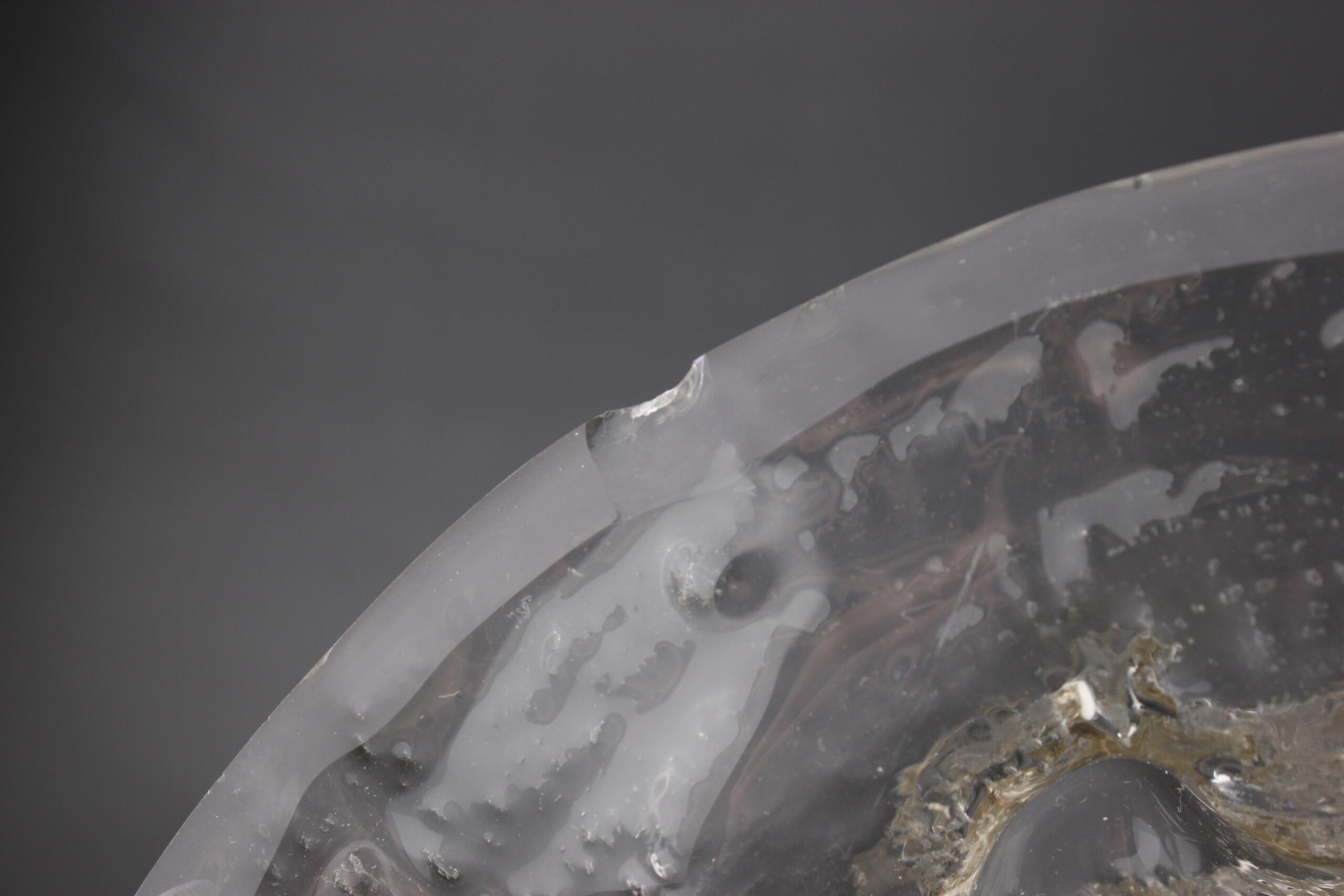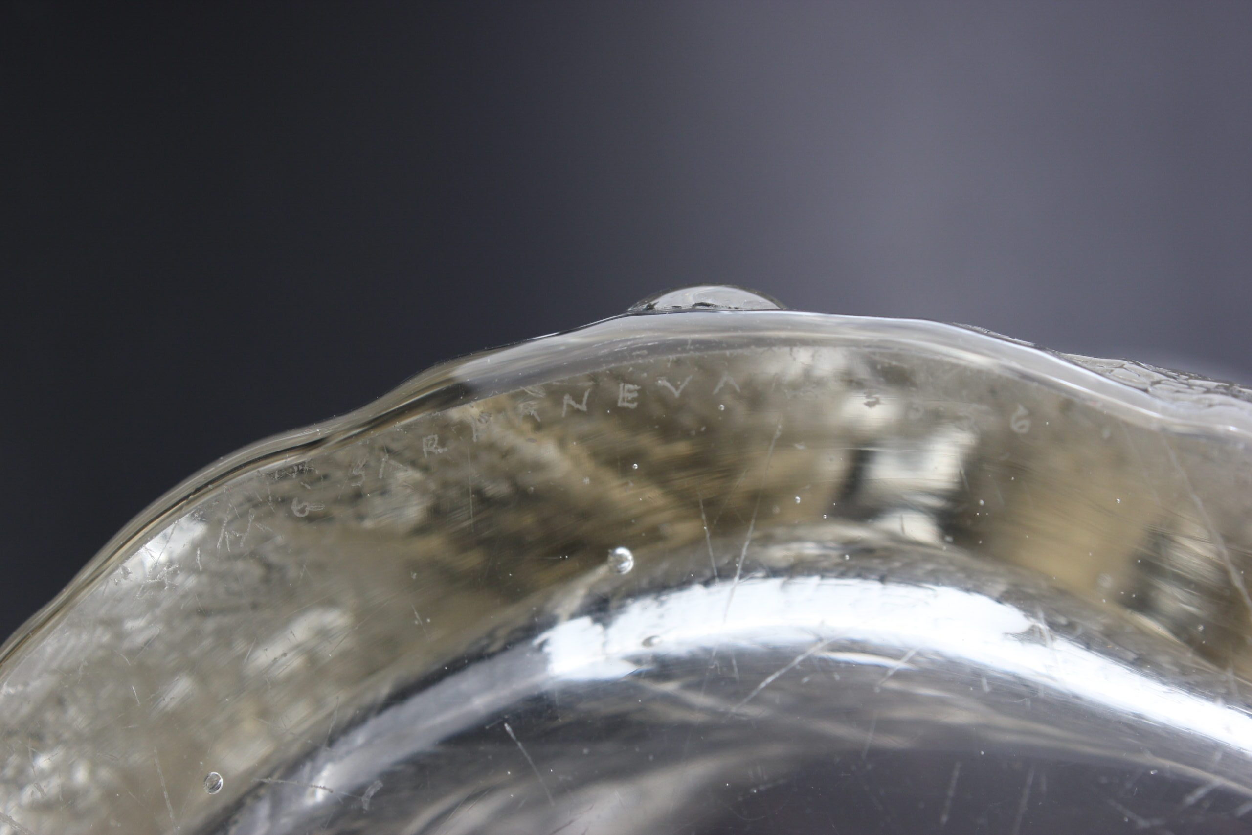 Kunto: yläreunassa useita lohkeamia, pohjassa kulumaa, käytön jälkiä, pohjassa naarmuja