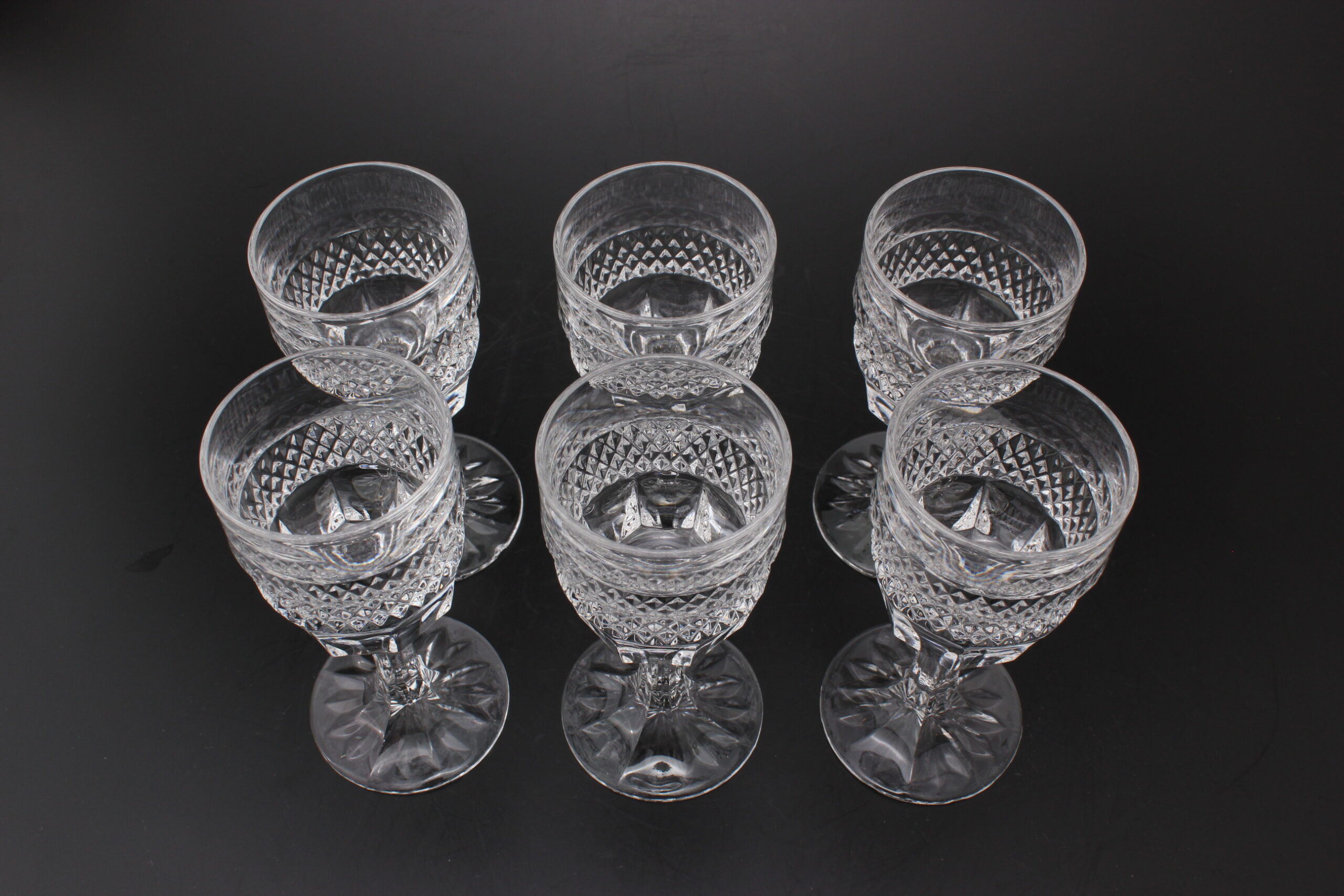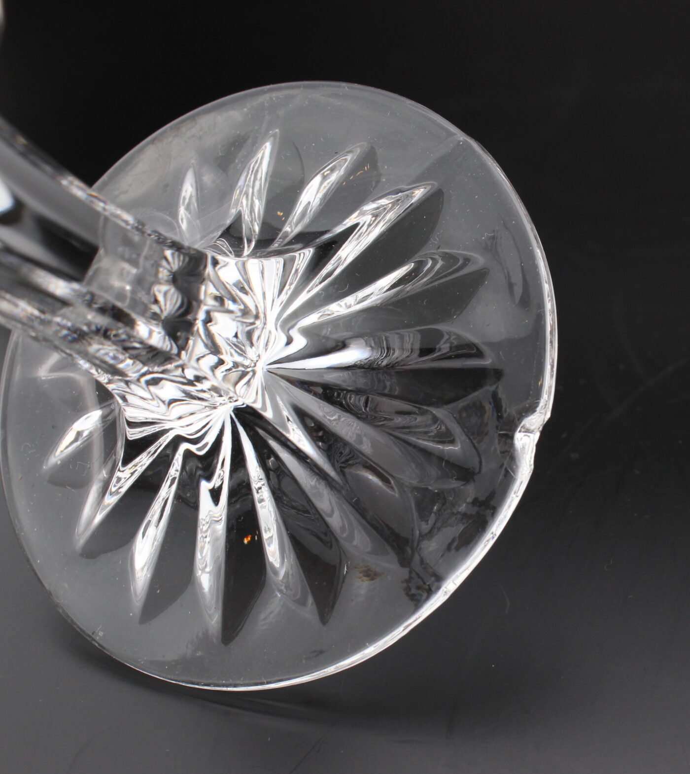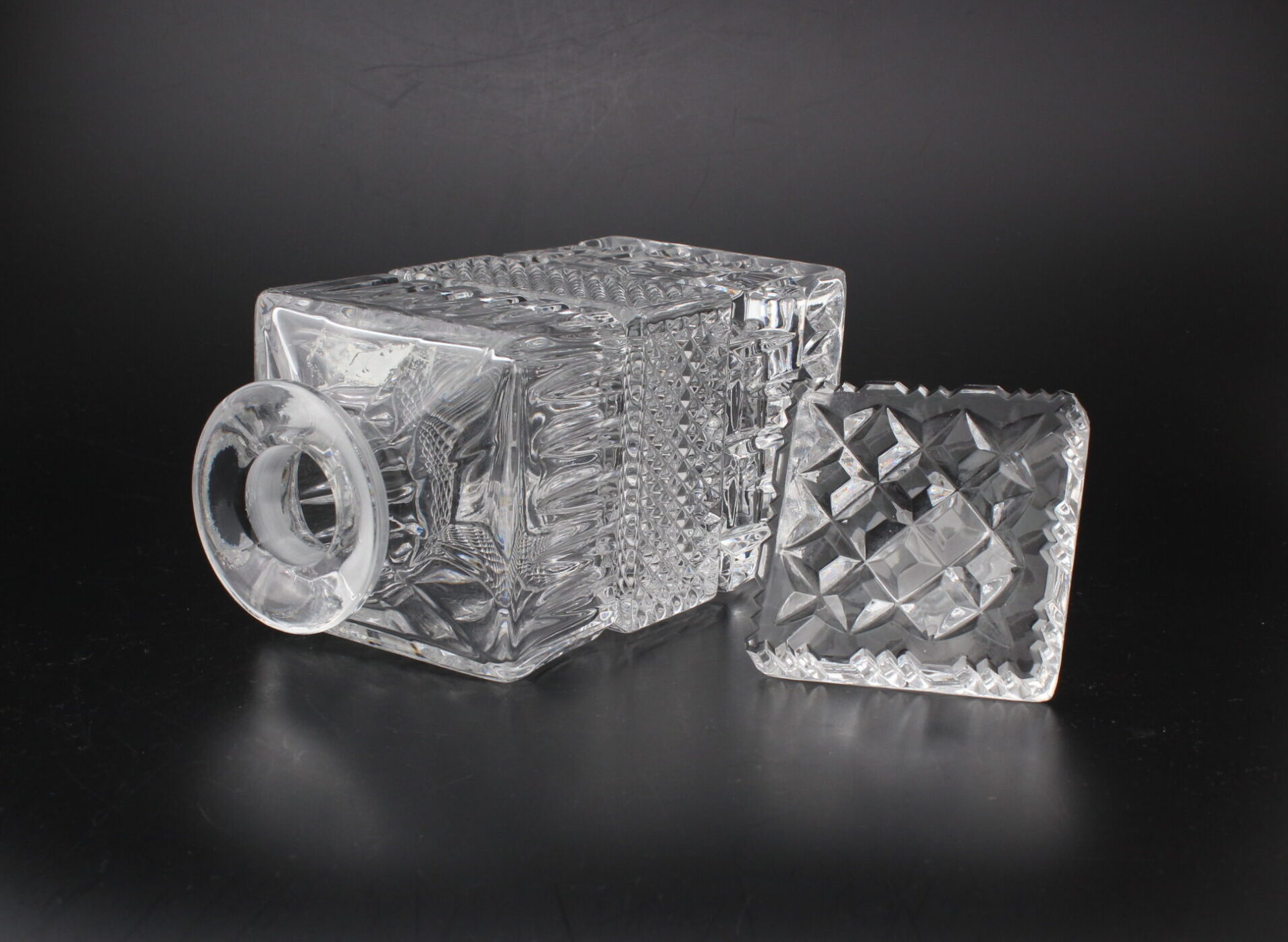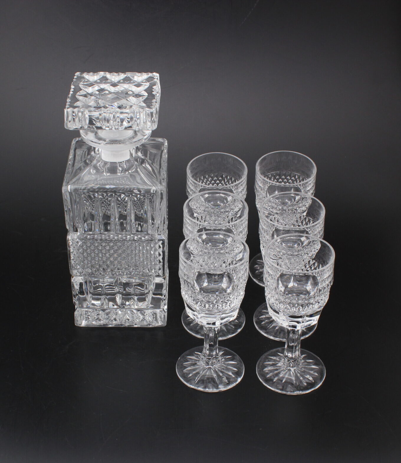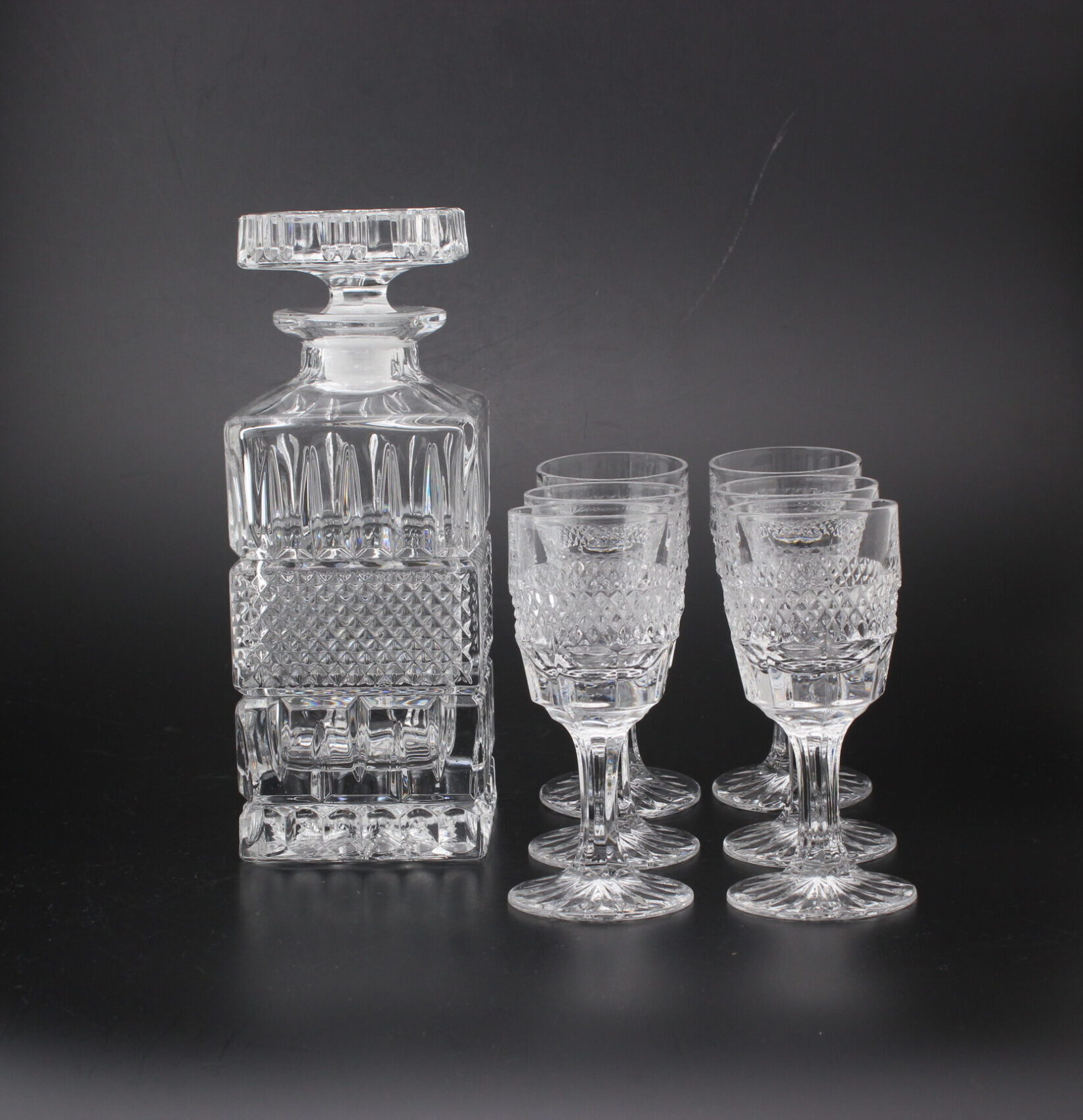 Kunto: karahvi ehjä, yhden lasin jalassa lohkeama, toisen lasin jalassa pientä karheutta, käytön jälkiä, pieniä naarmuja, karahvissa tarrajäämä