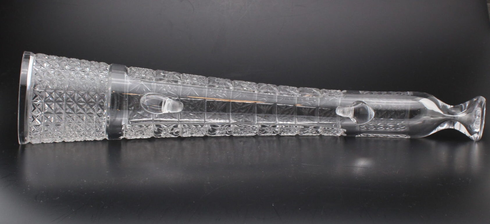 Mitat: pituus 44,2 cm, halkaisija 9 cm, paino 1227 g