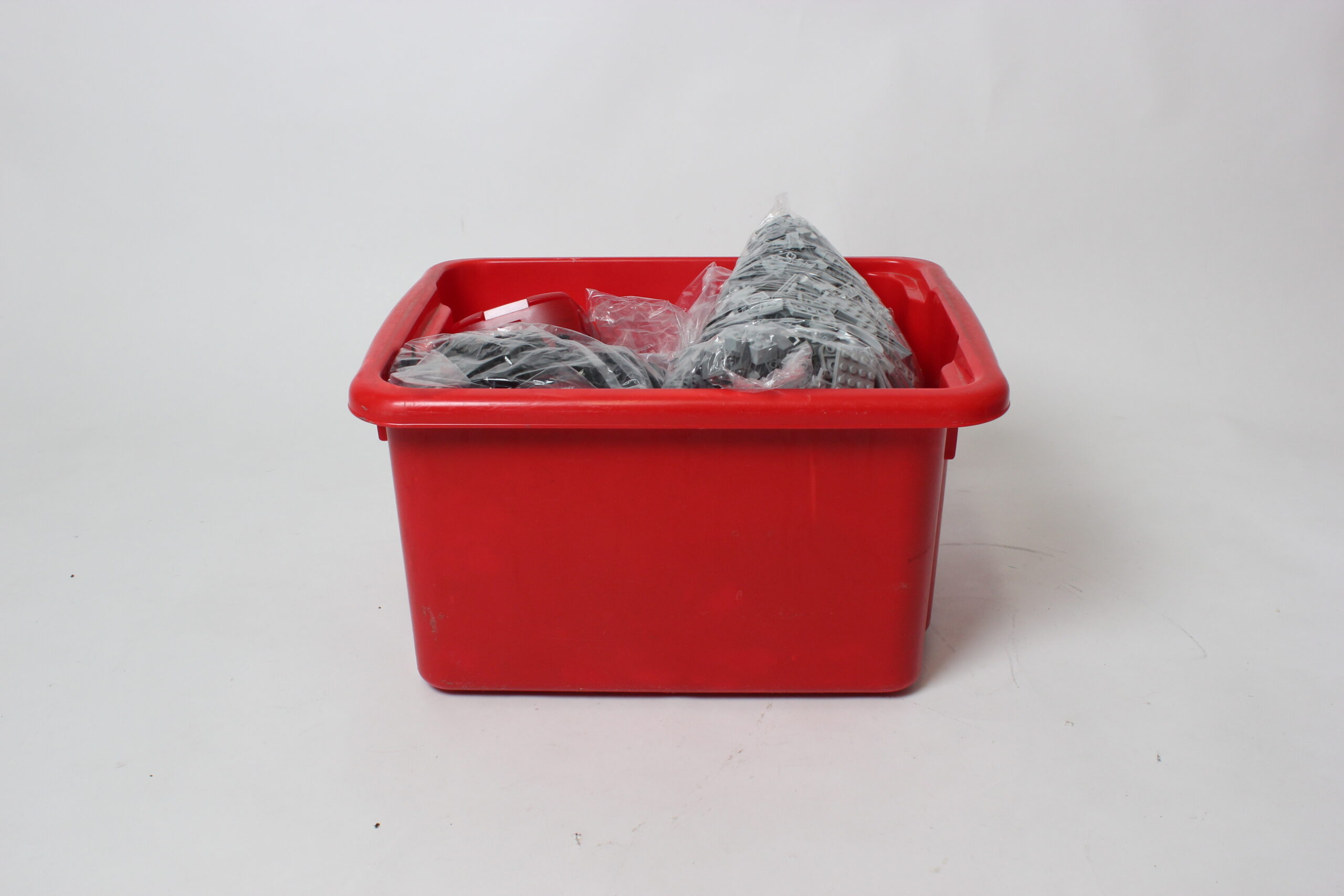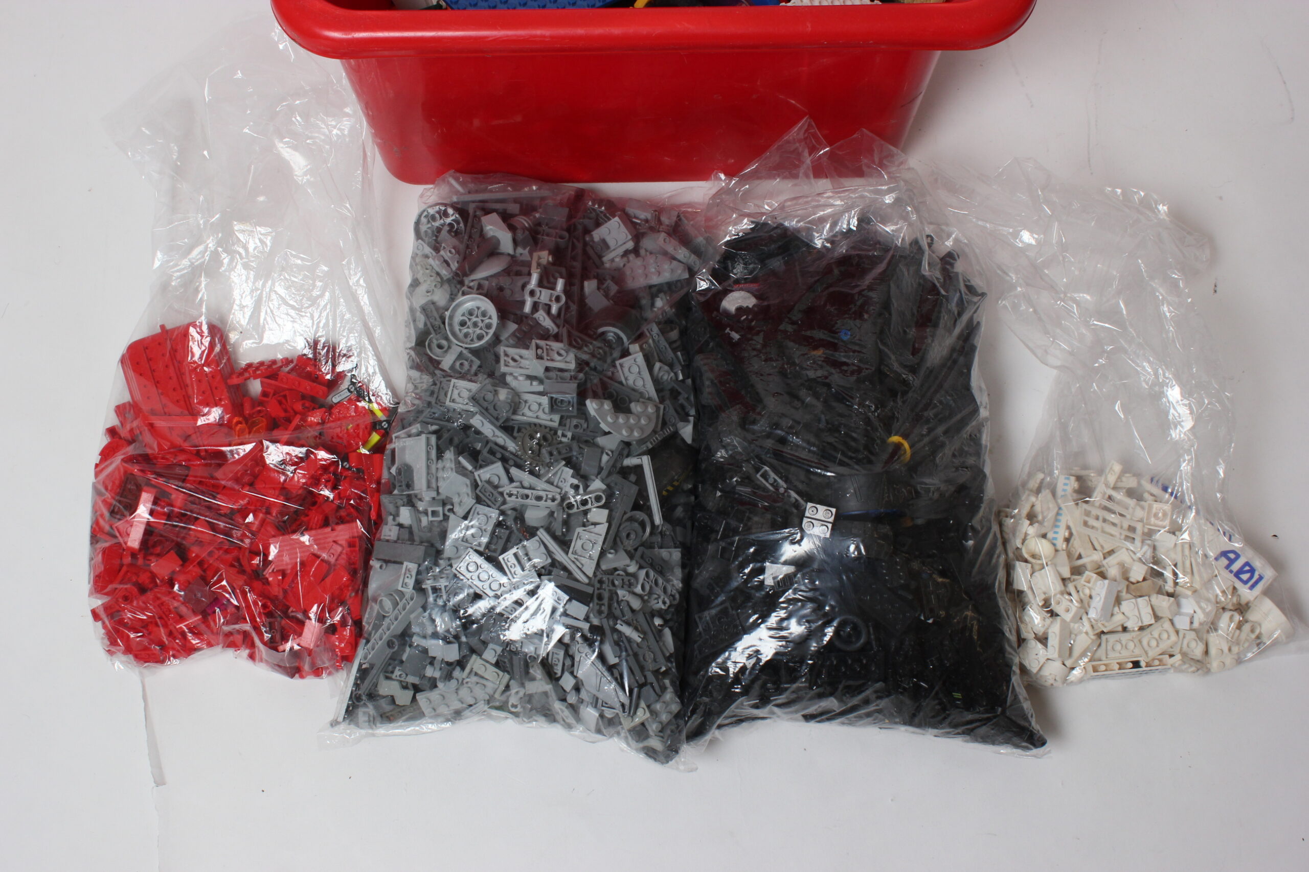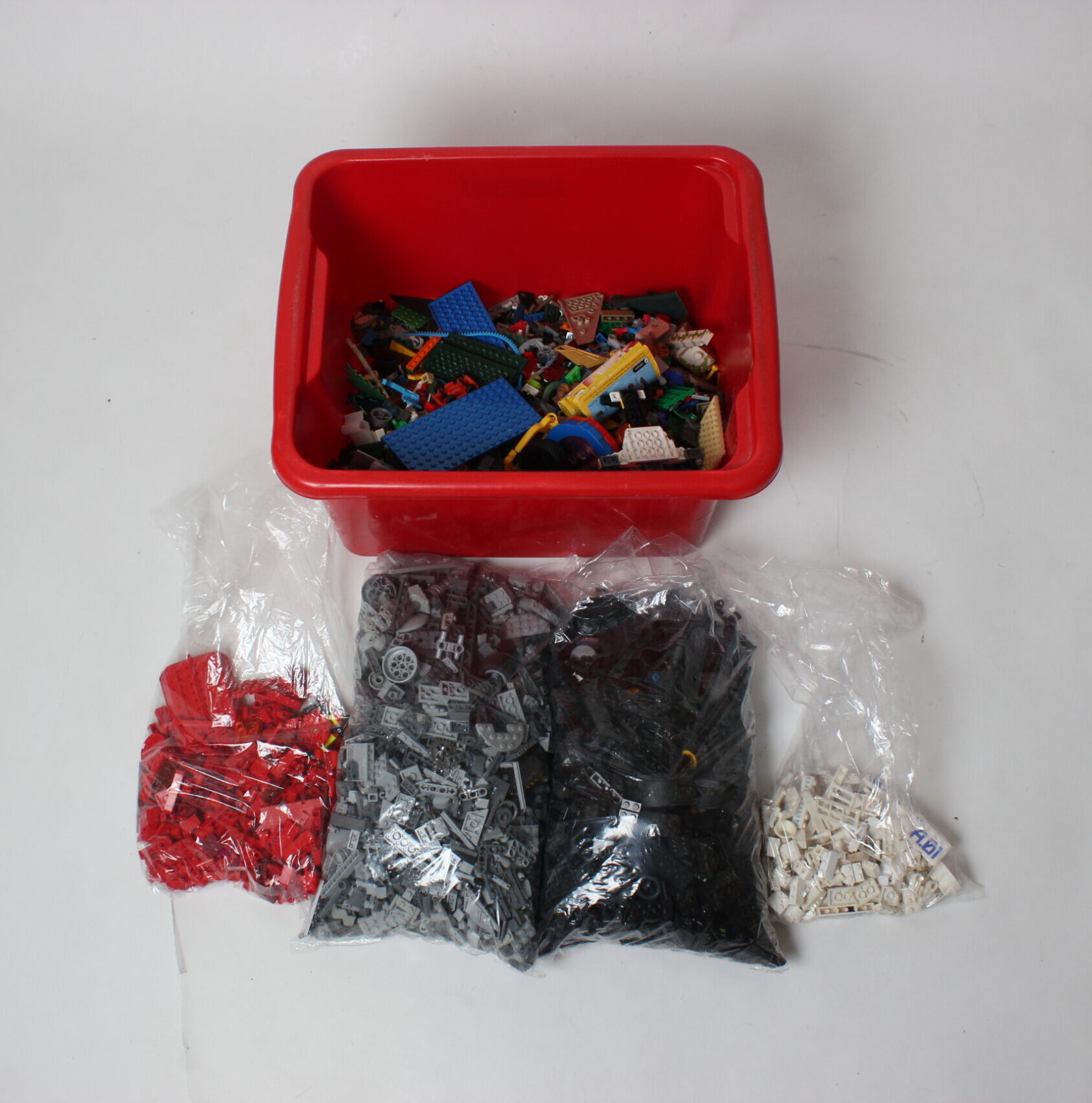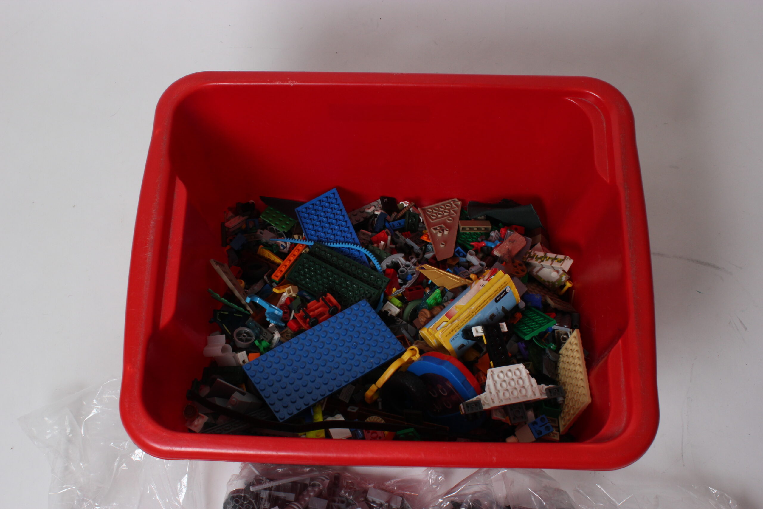 Iso setti legoja säilytyslaatikossa. Legot osittain lajiteltu värin mukaan.