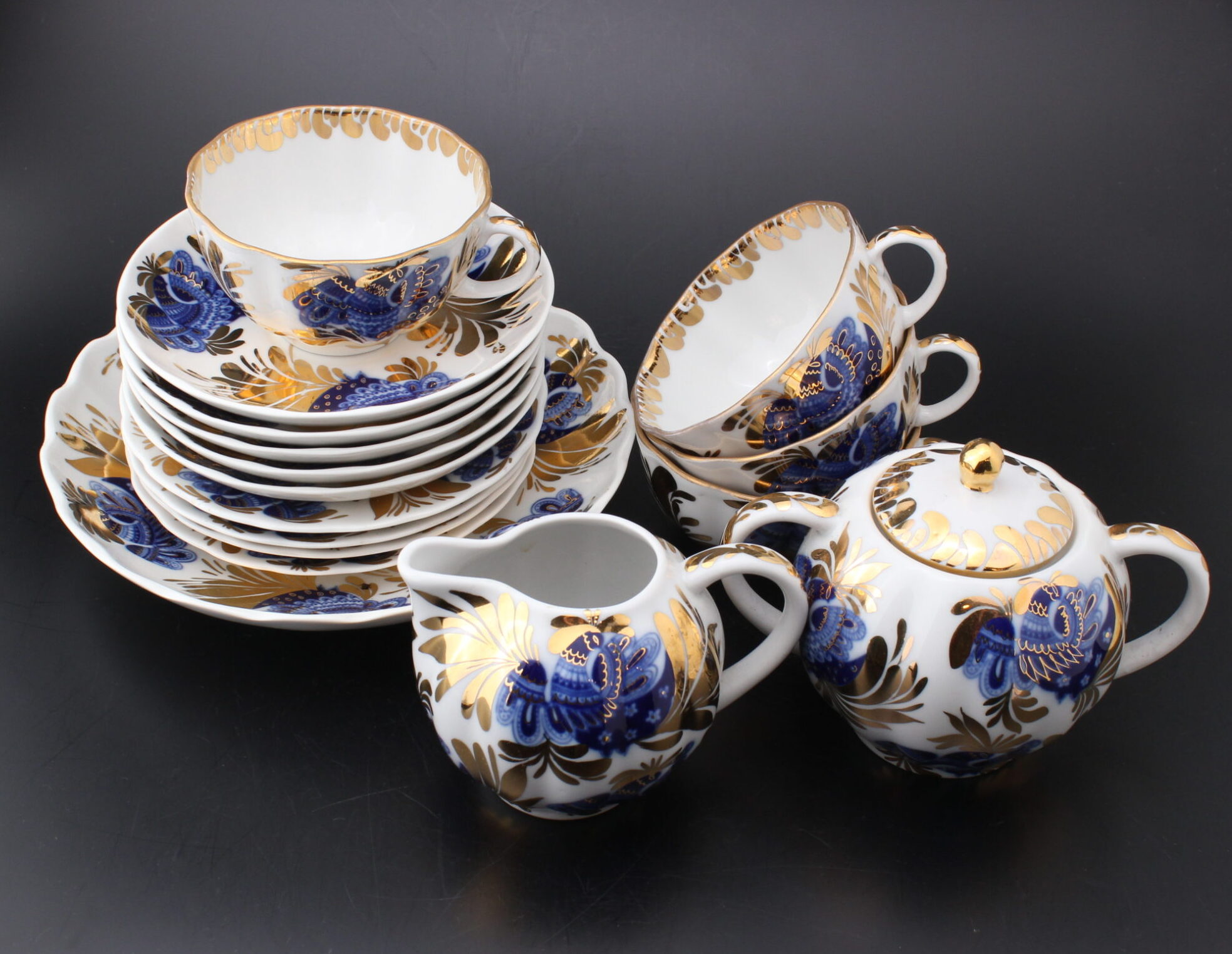 Lomonosovin valmistama astiasto neljälle. Settiin kuuluu neljä kuppia, viisi tassia, neljä pullalautasta, sokerikko, kermakko ja tarjoilukulho.