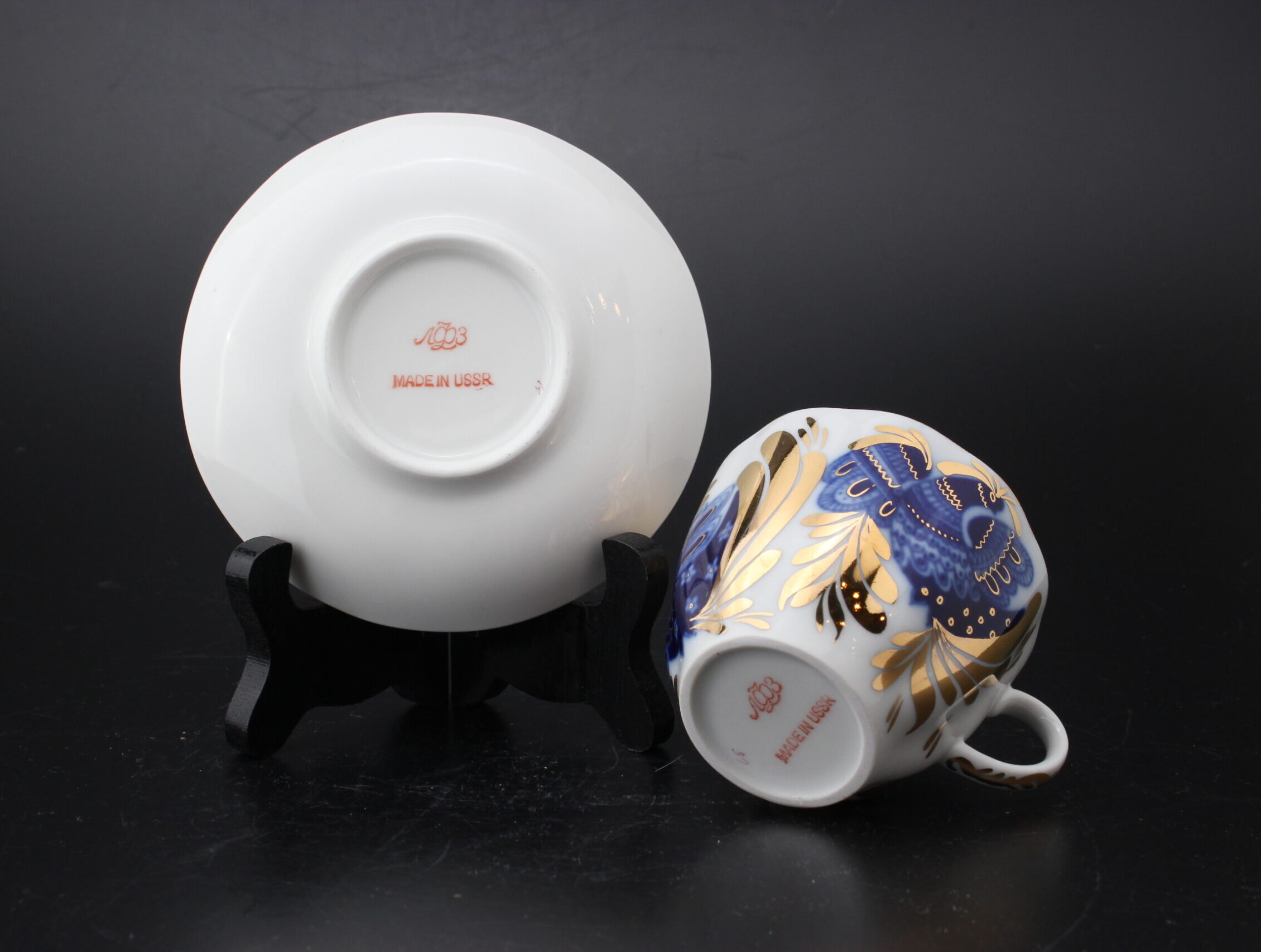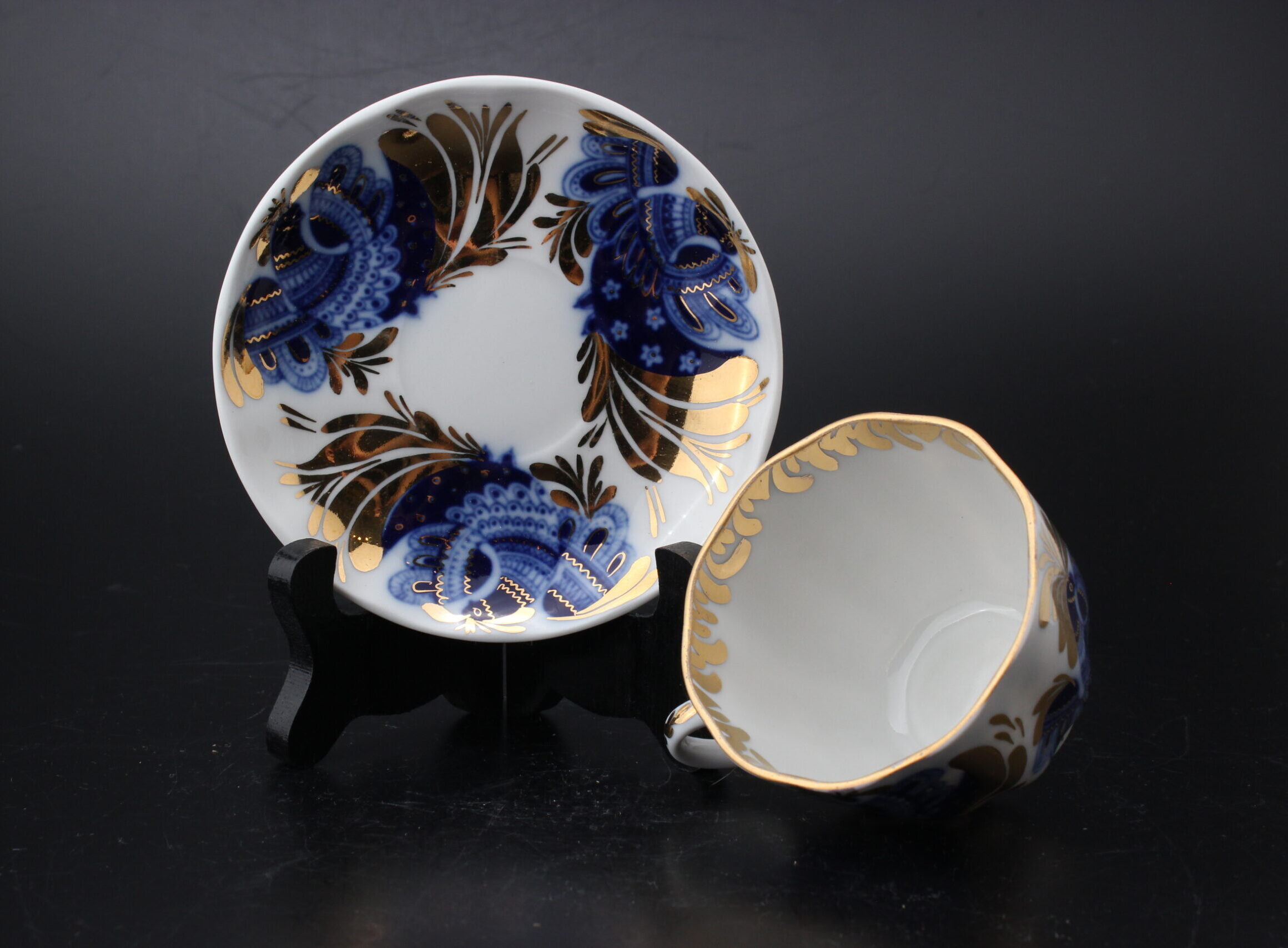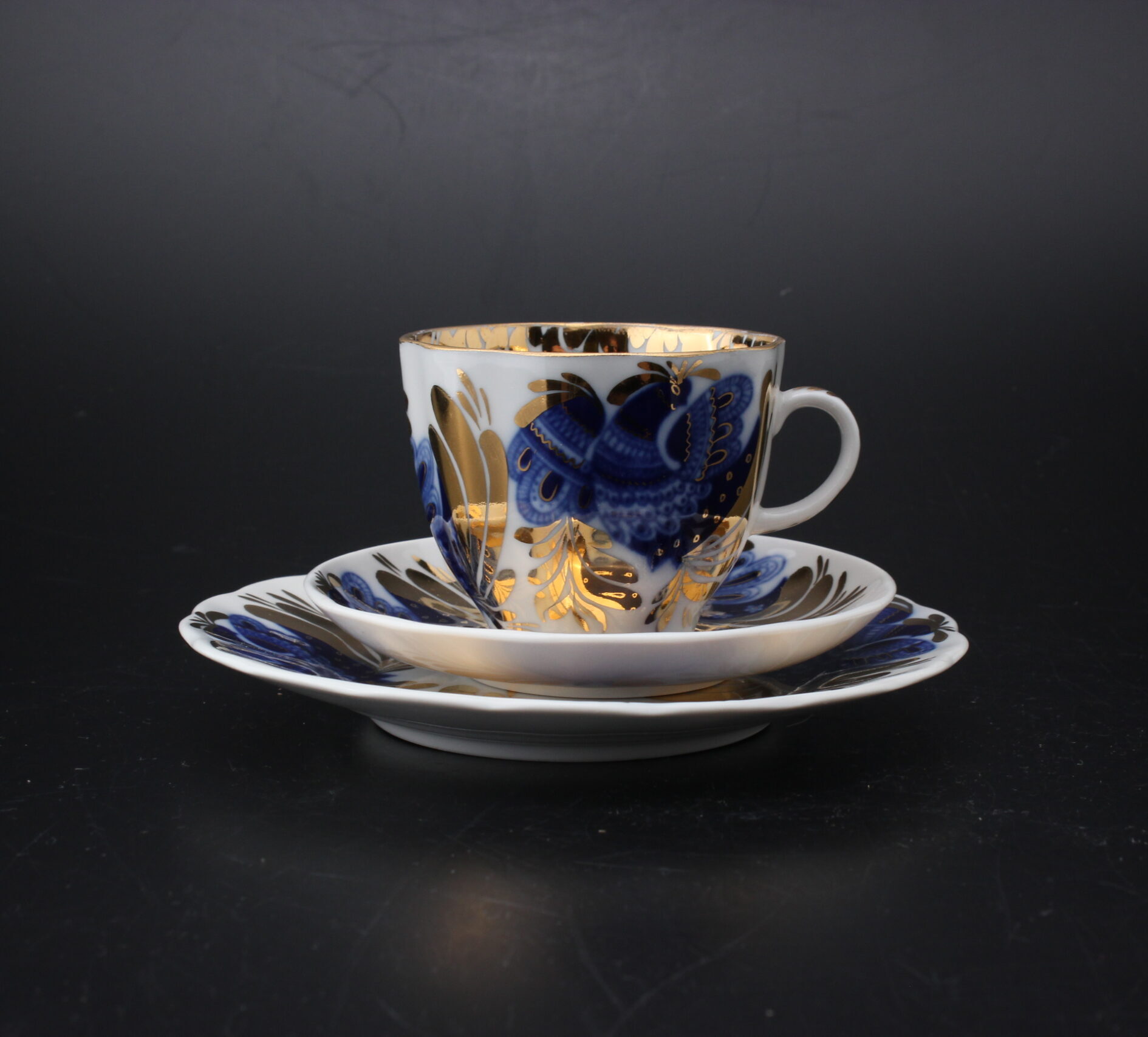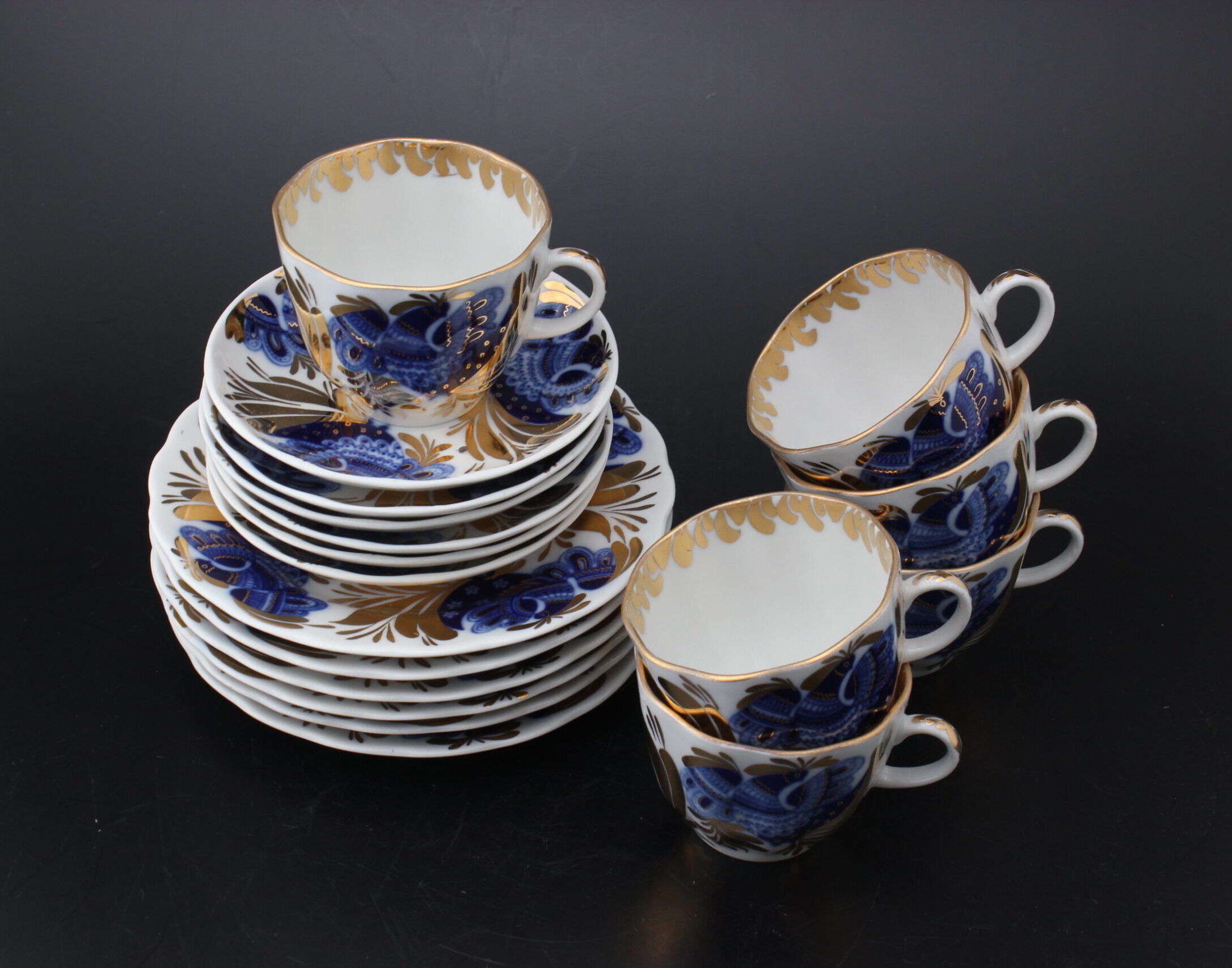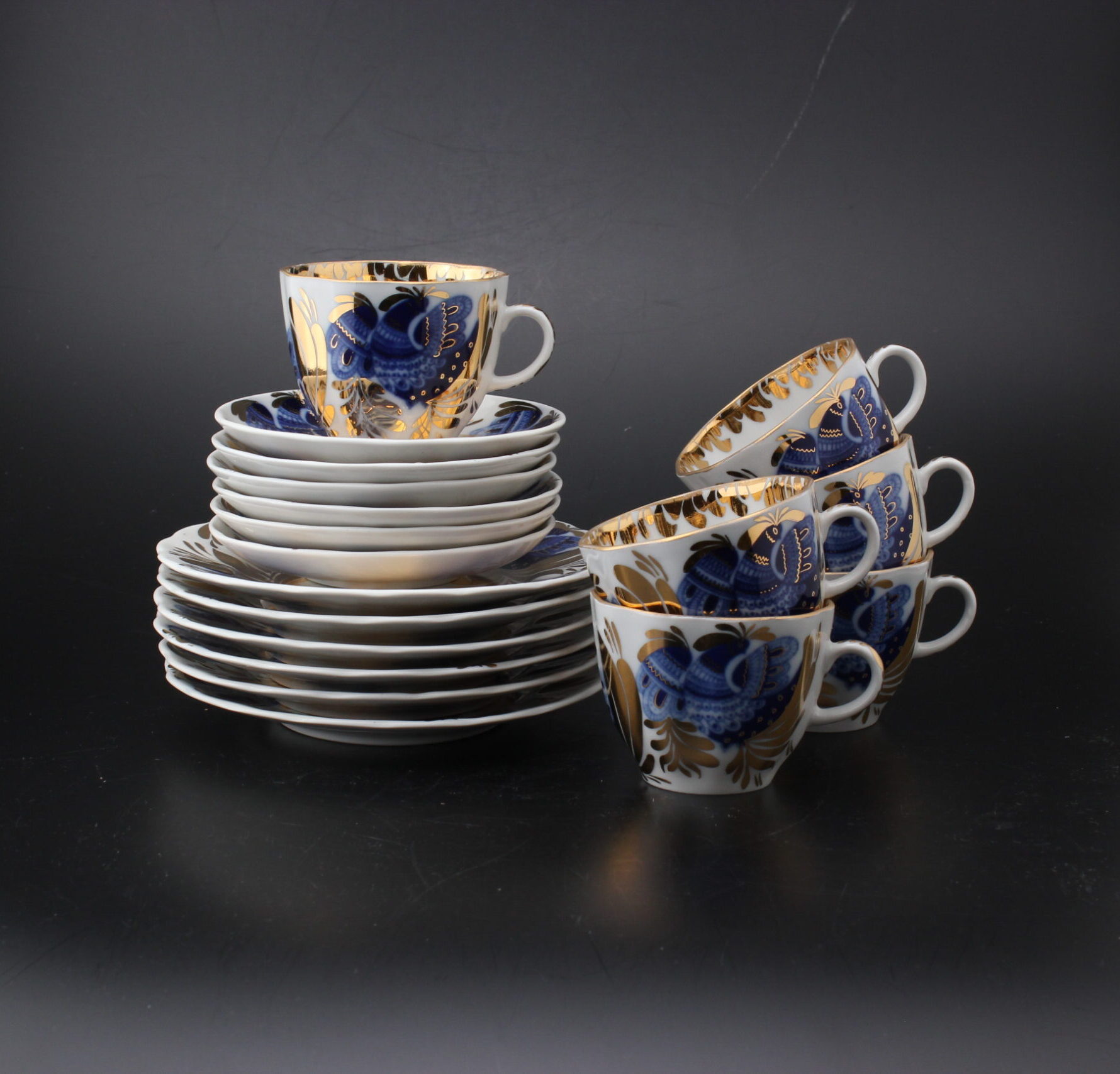 Lomonosovin valmistama astiasto kuudelle. Settiin kuuluu kuusi kuppia, kuusi tassia ja kuusi pullalautasta.