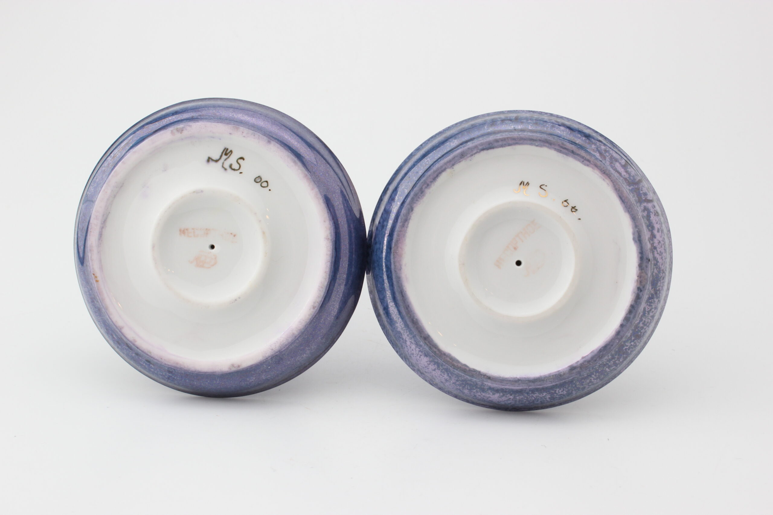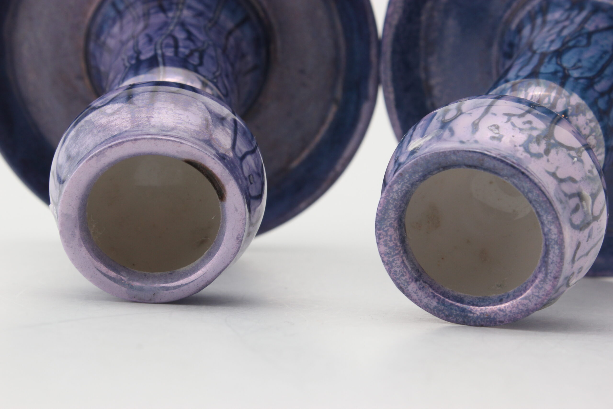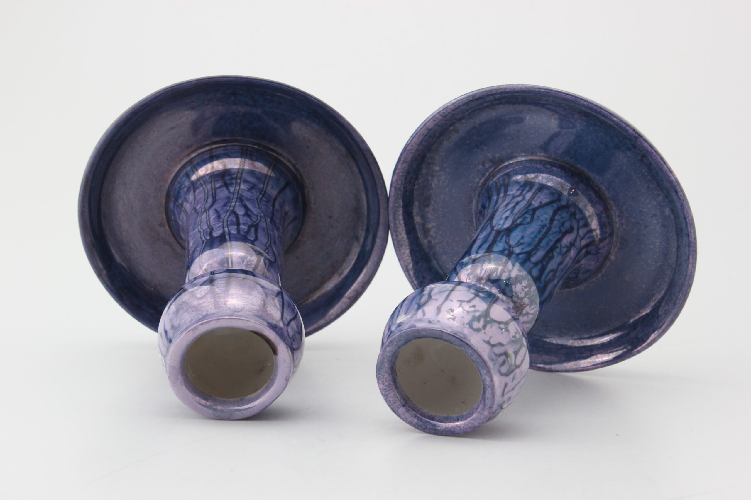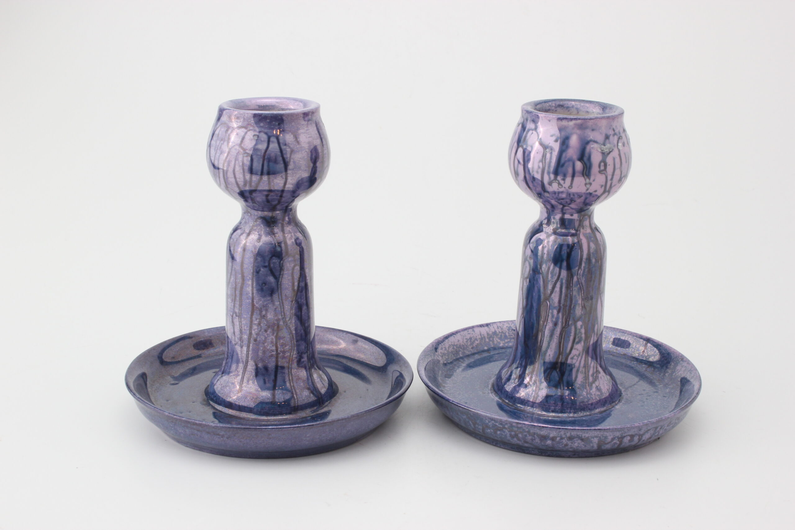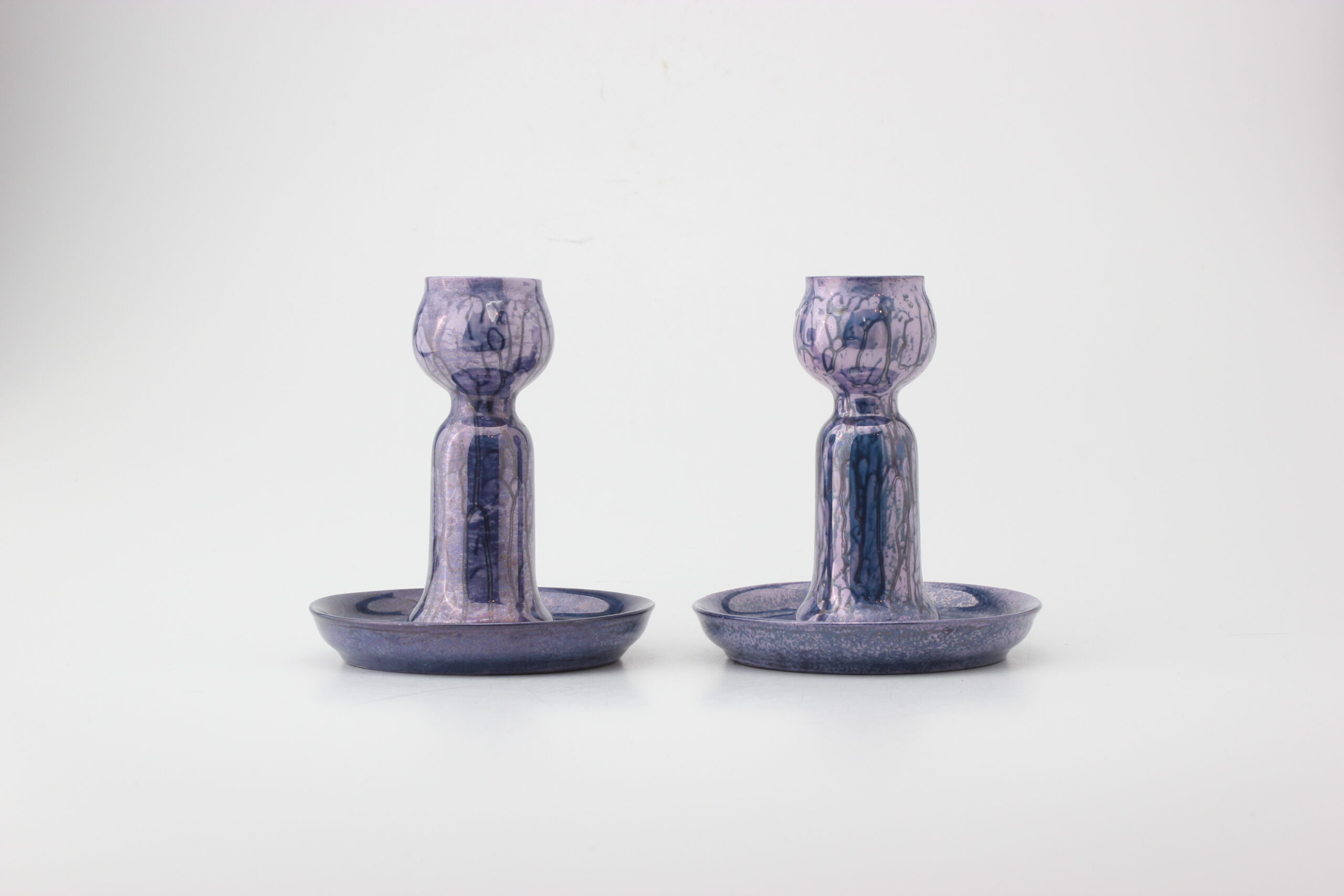Lomonosovin valmistamat ja uudelleen lasitetut kauniit kynttilänjalat. Pohjassa signeeraus MS joka viittaa pinnoitteeseen.
