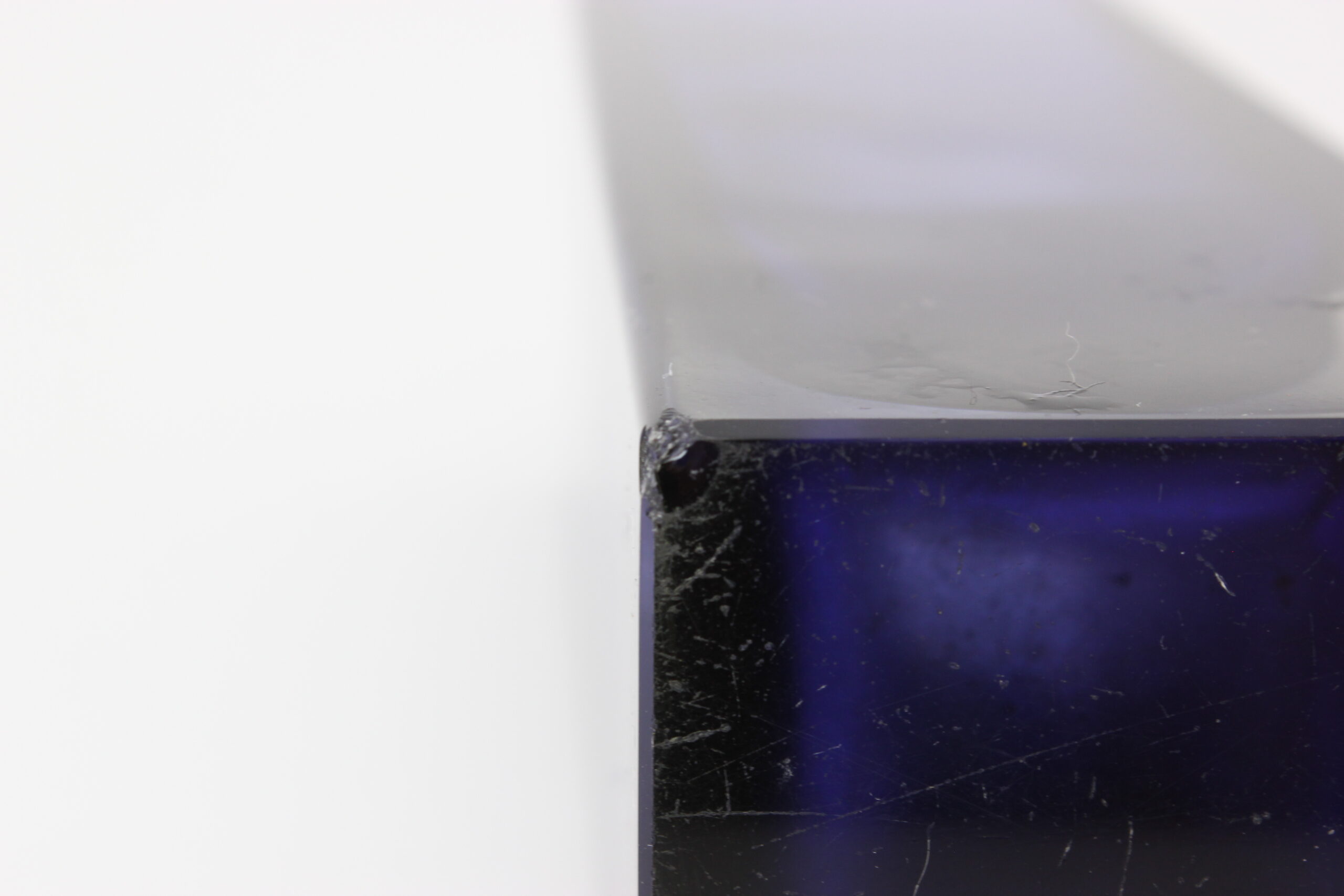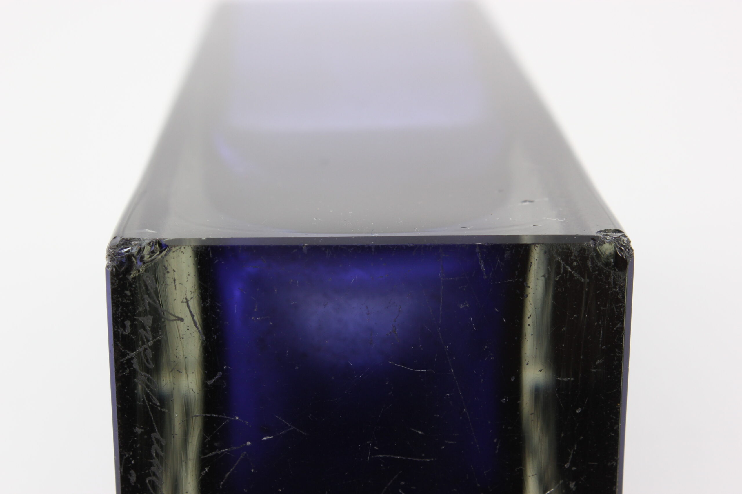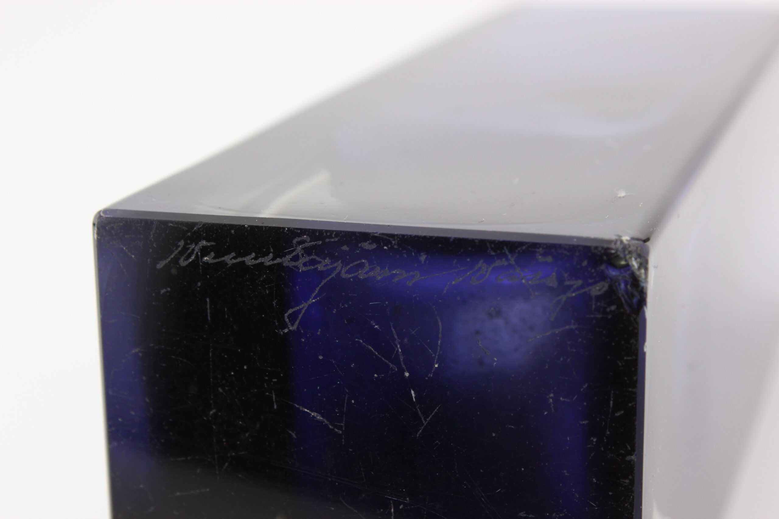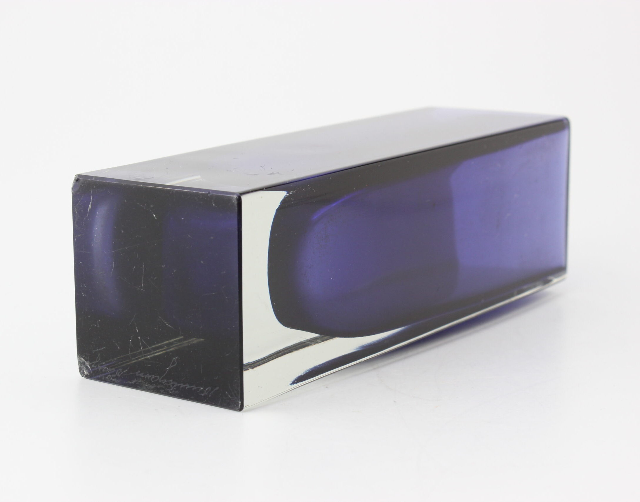 Kunto: pohjassa kahdessa nurkassa lohkeama, käytön jälkiä, naarmuja, likaa