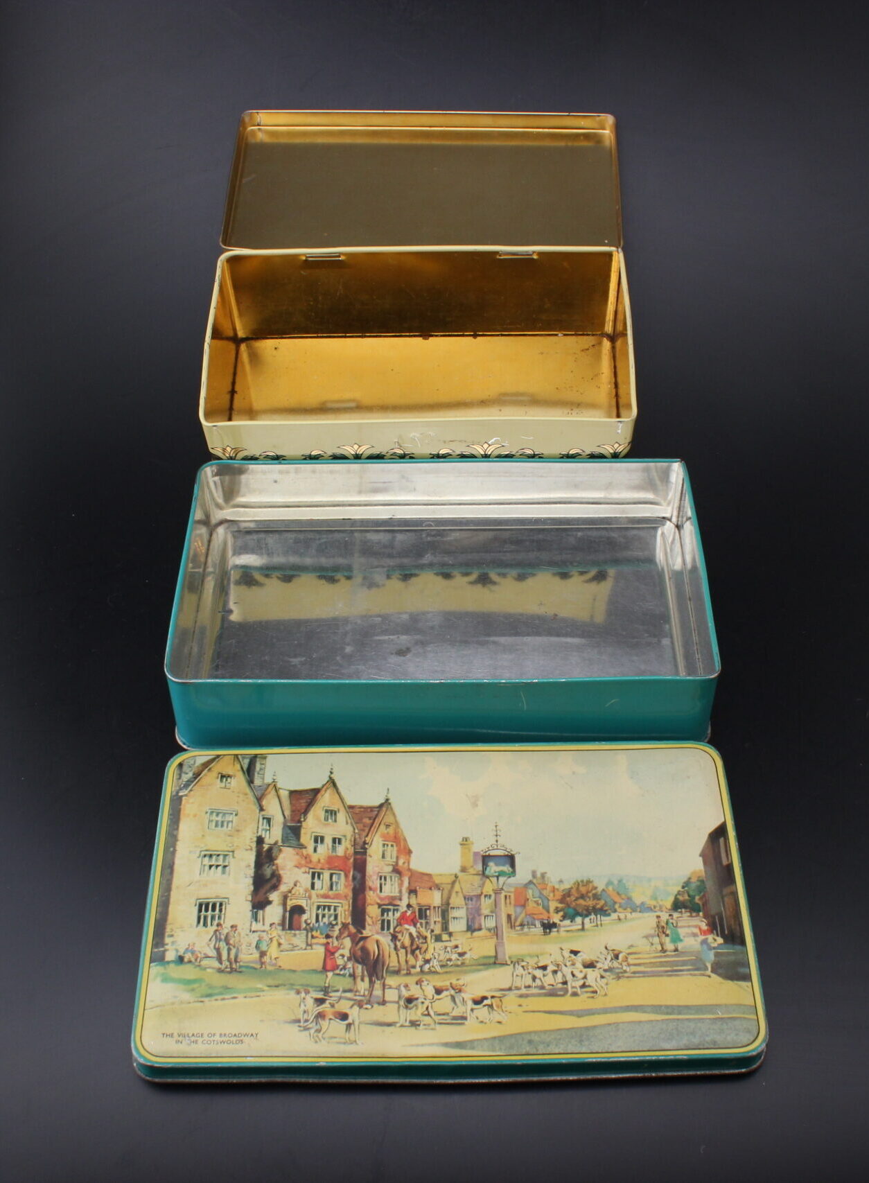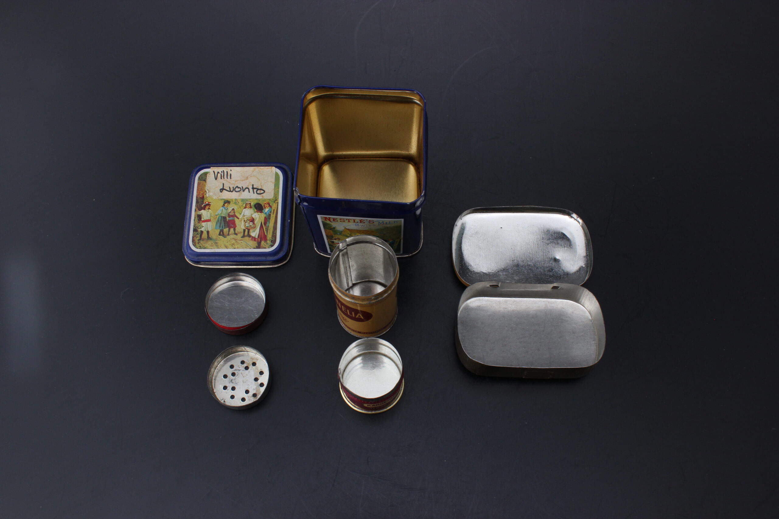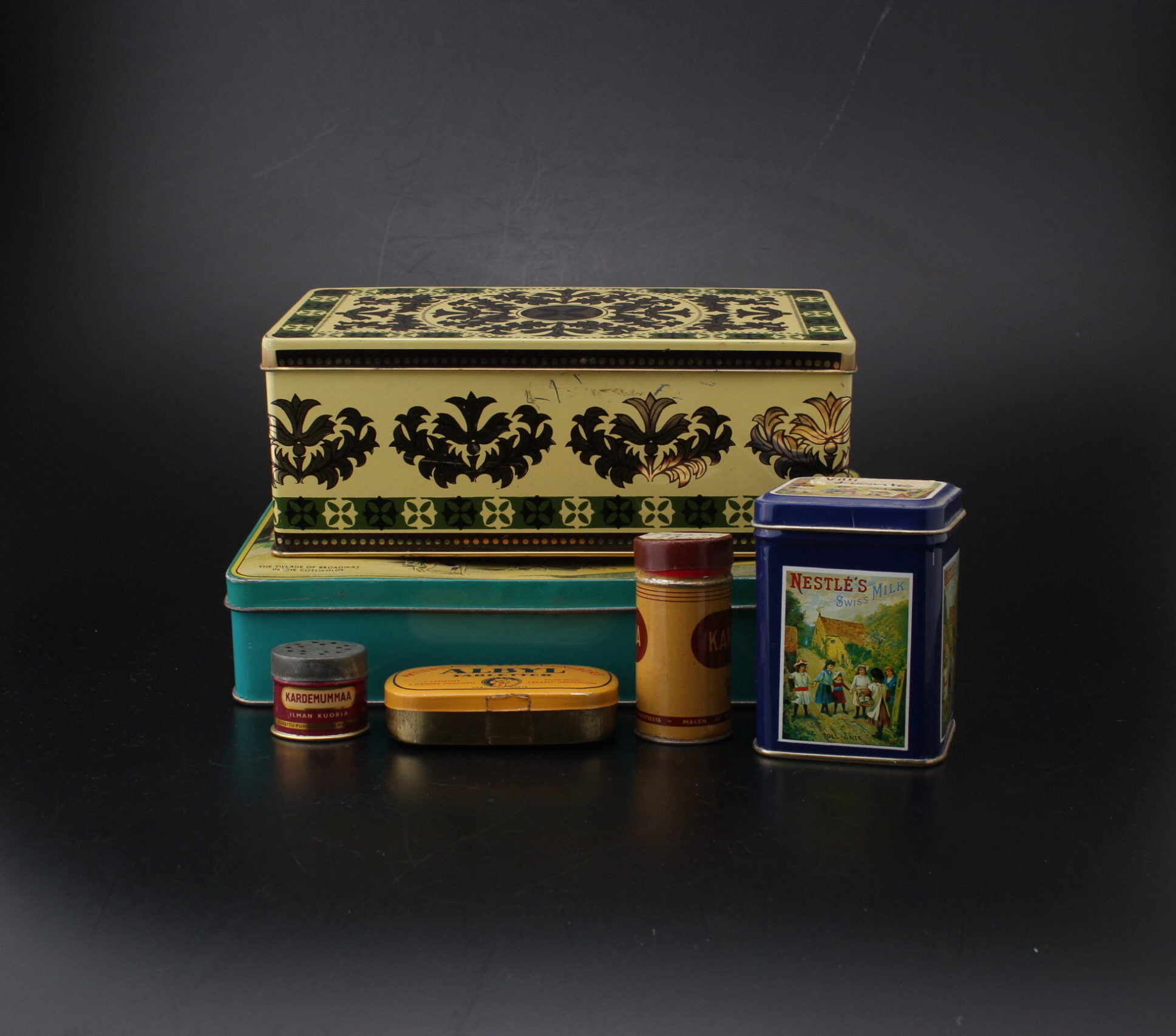 Kuusi erilaista ja erikokoista vanhaa peltirasiaa.