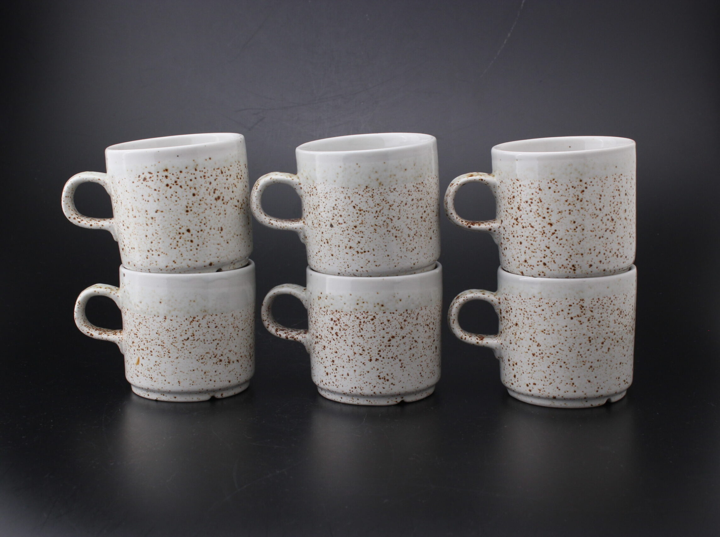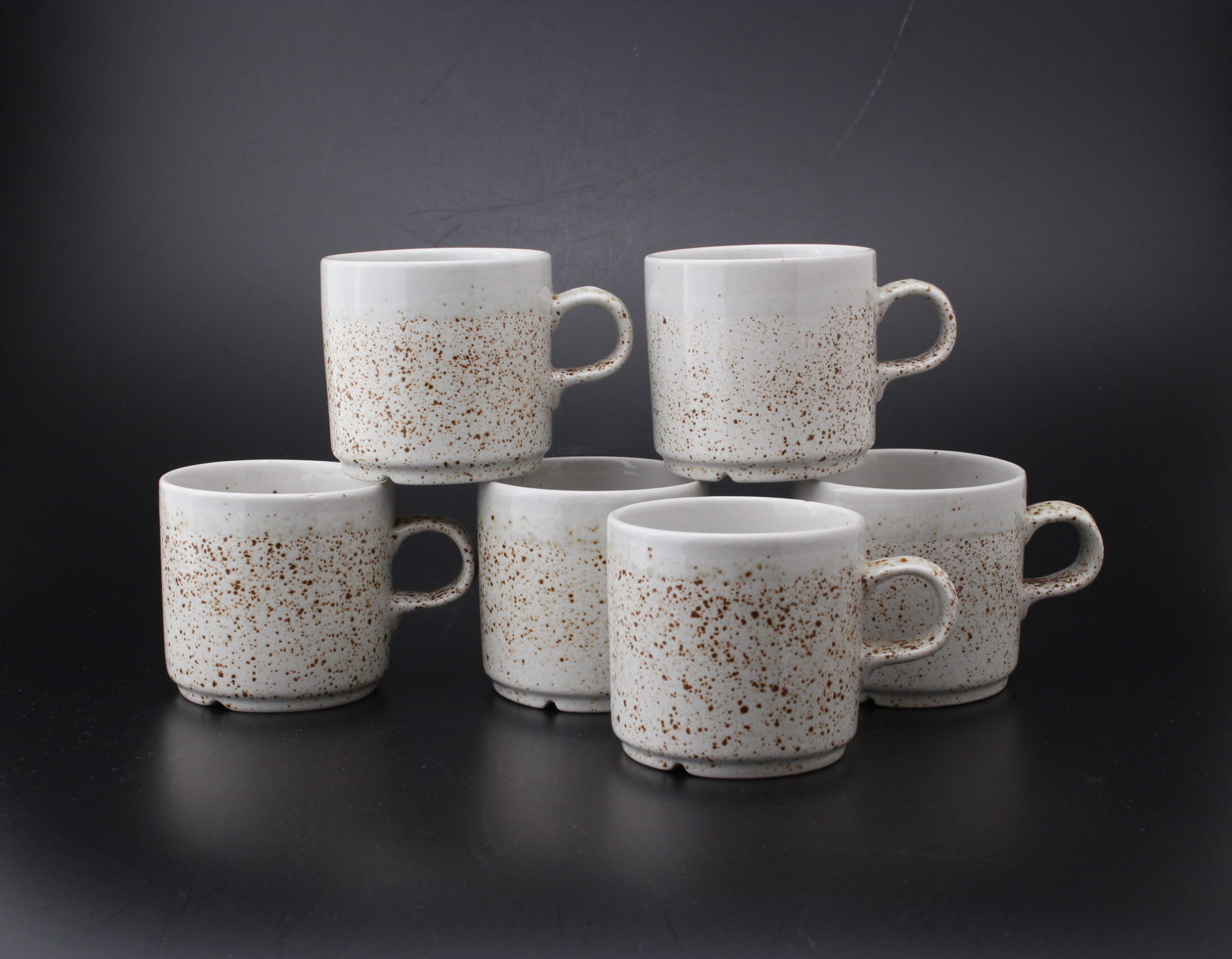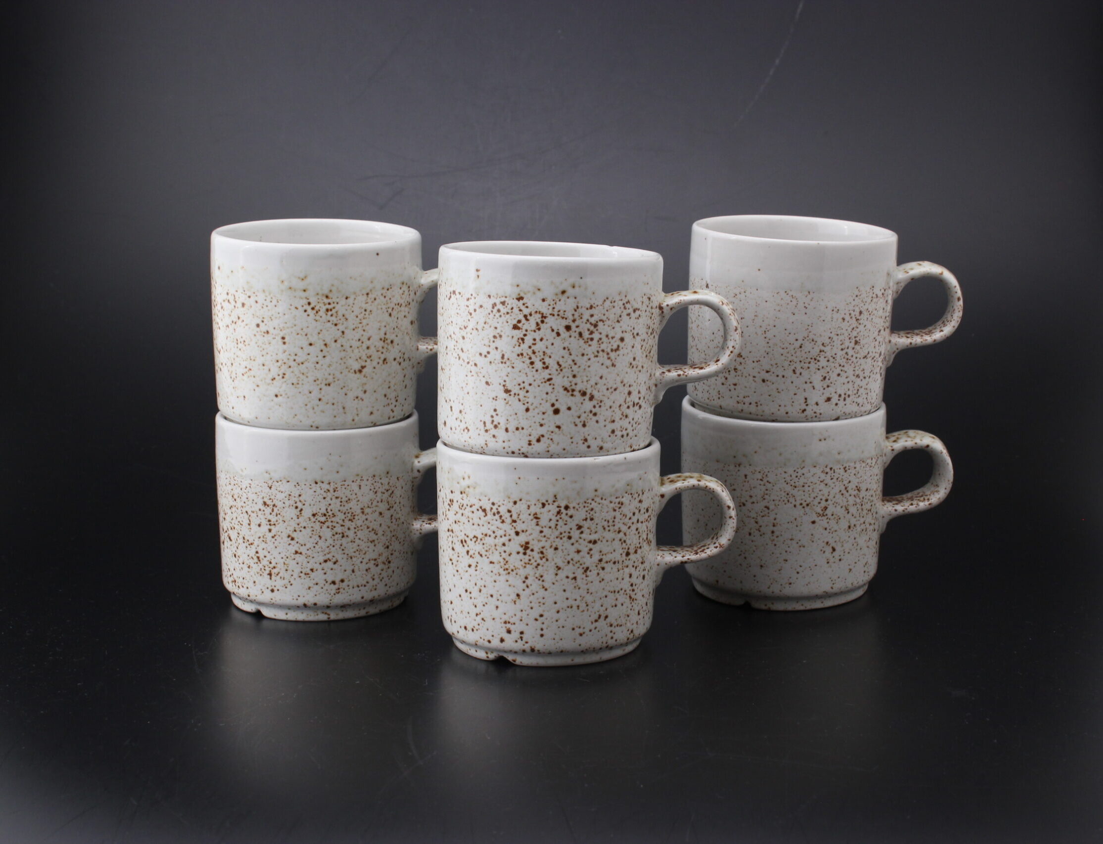 Kunto: yhdessä kupissa pieni särö reunassa, hieman käytön jälkiä, pientä kulumaa, ruskeiden pilkkujen määrä vaihtelee