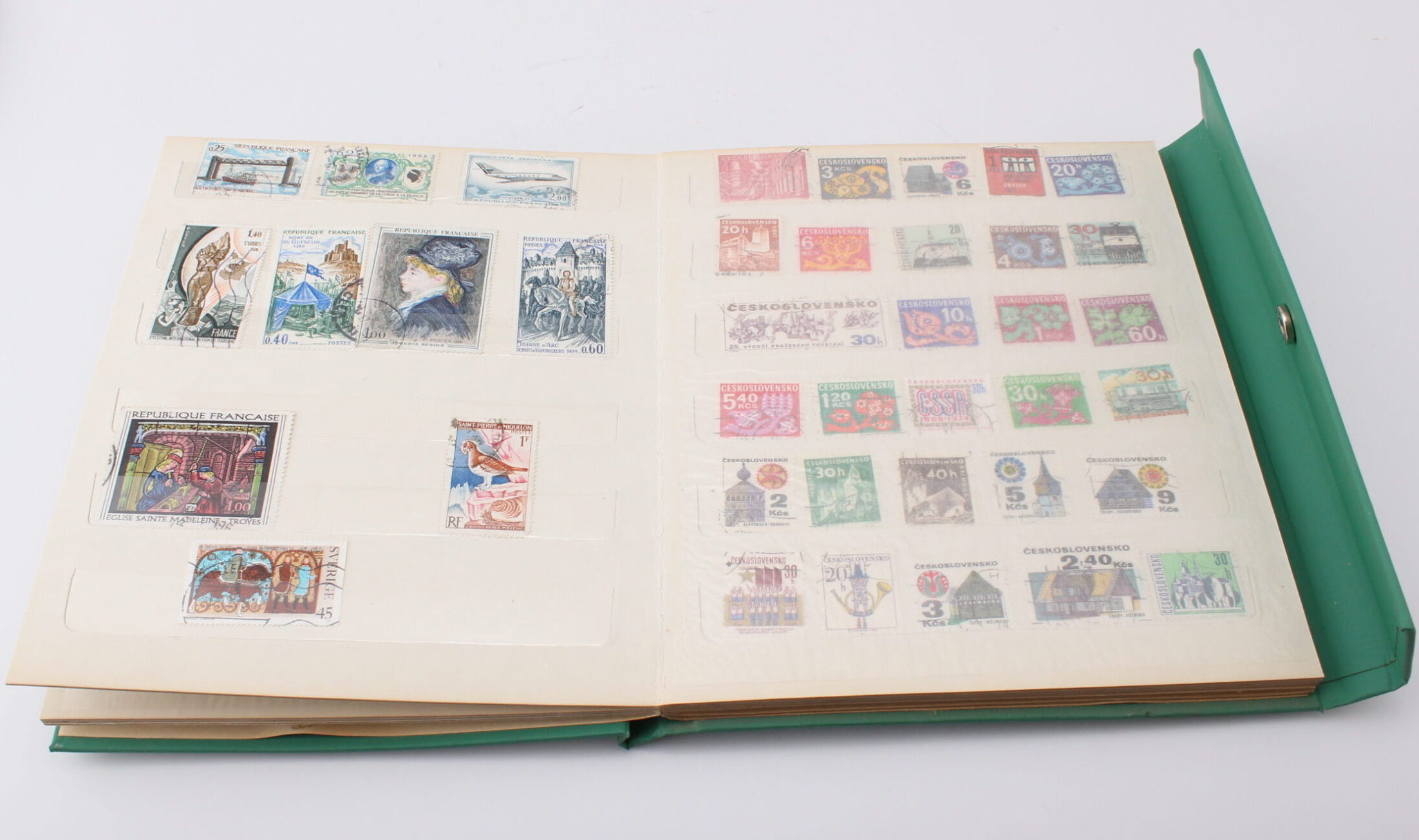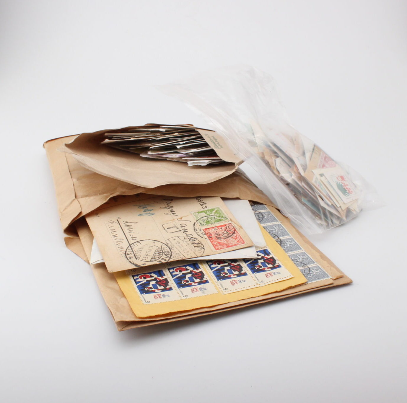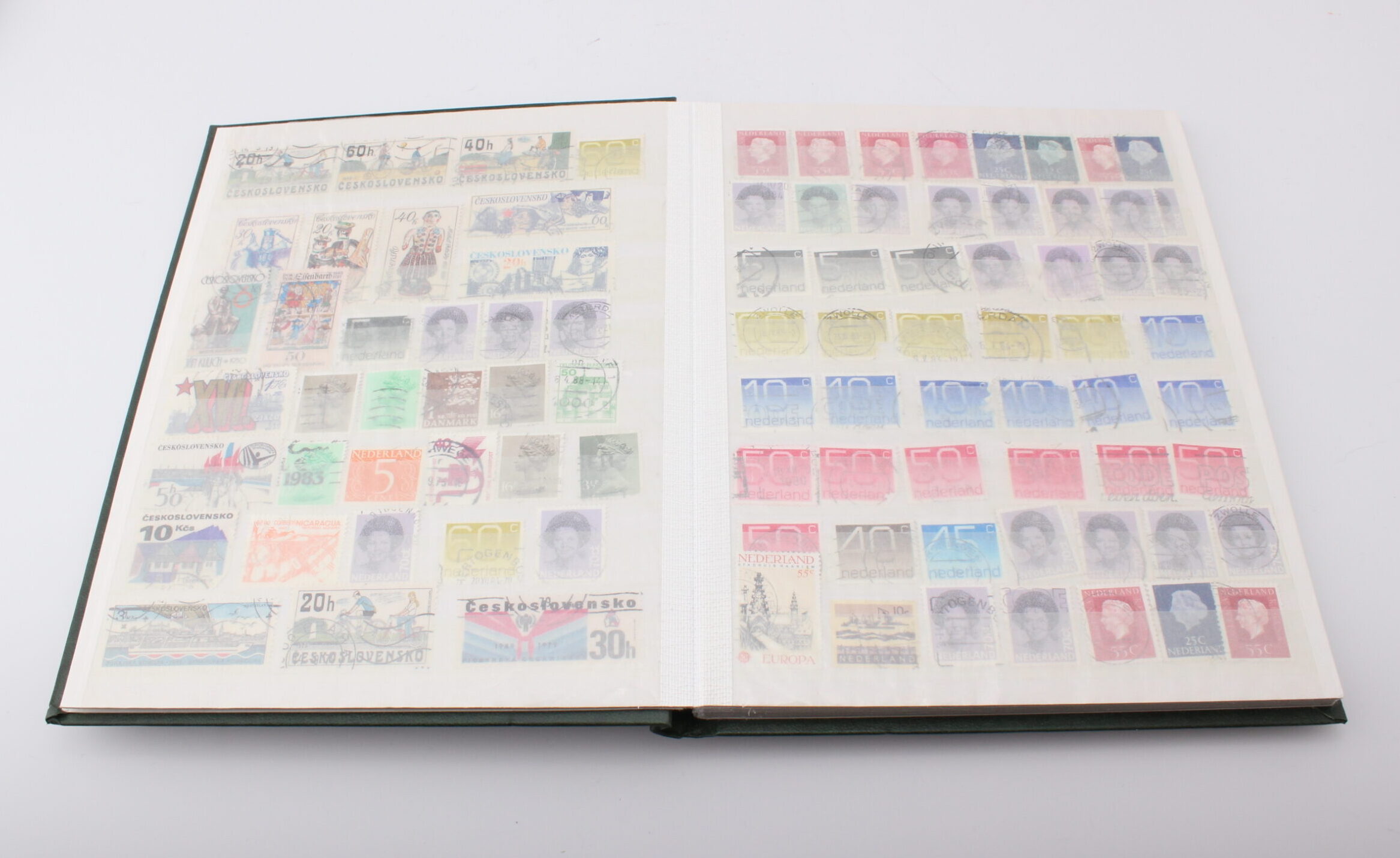 Viisi kansiota joissa postimerkkejä ympäri mailmaa.