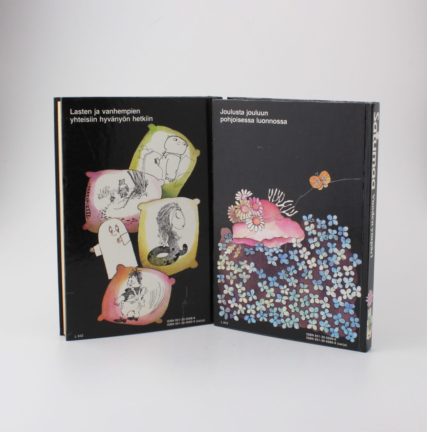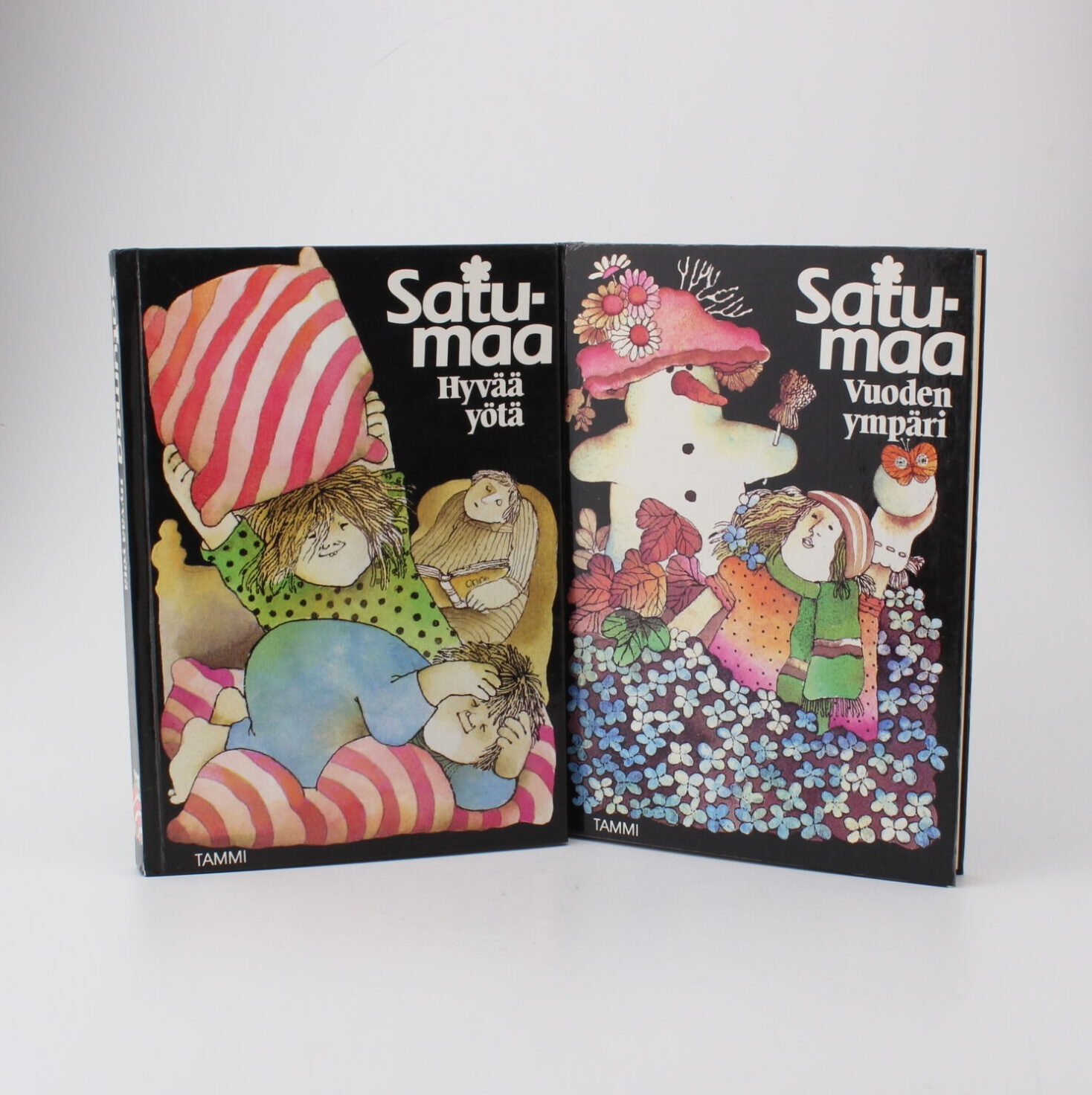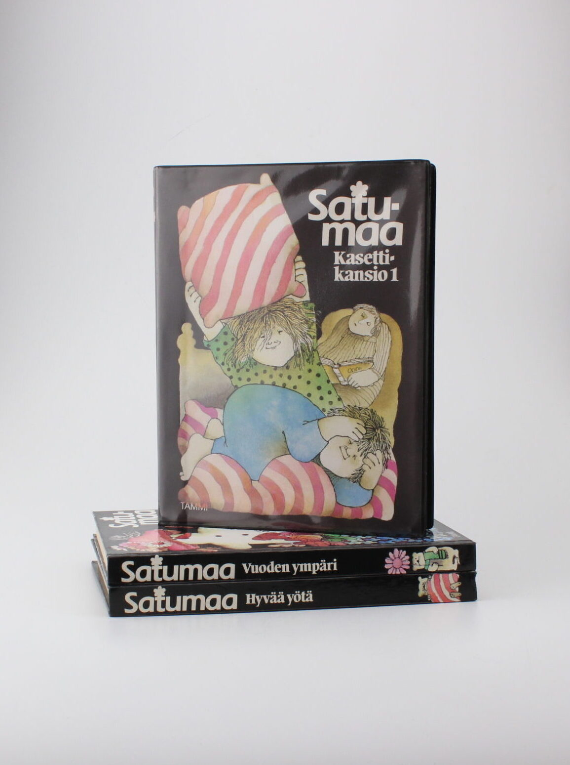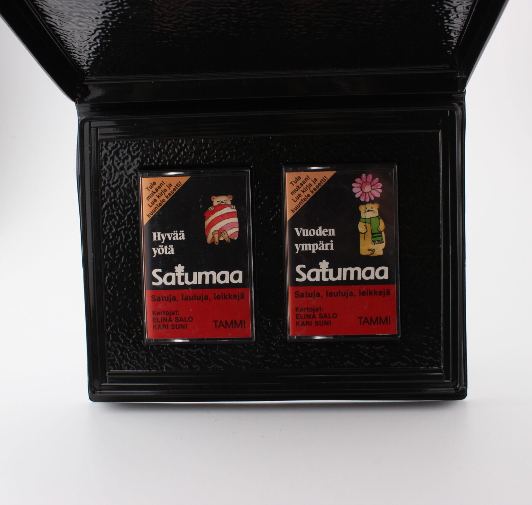 Satumaa kirjat Hyvää yötä ja Vuoden ympäri sekä samojen kirjojen äänikirja kasetit. Voi siis seurata kirjaa samalla kun kuulet tarinan kasetilta.