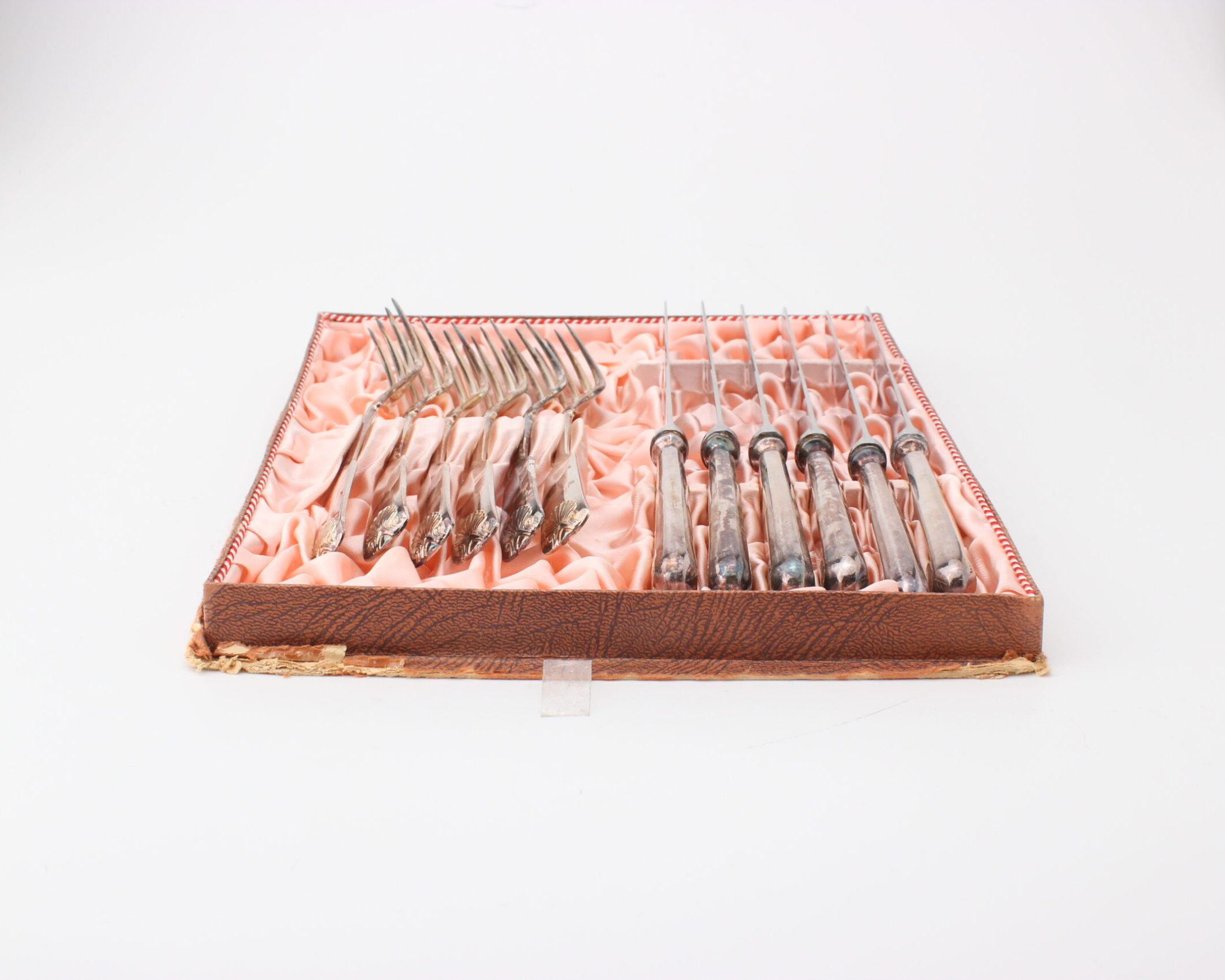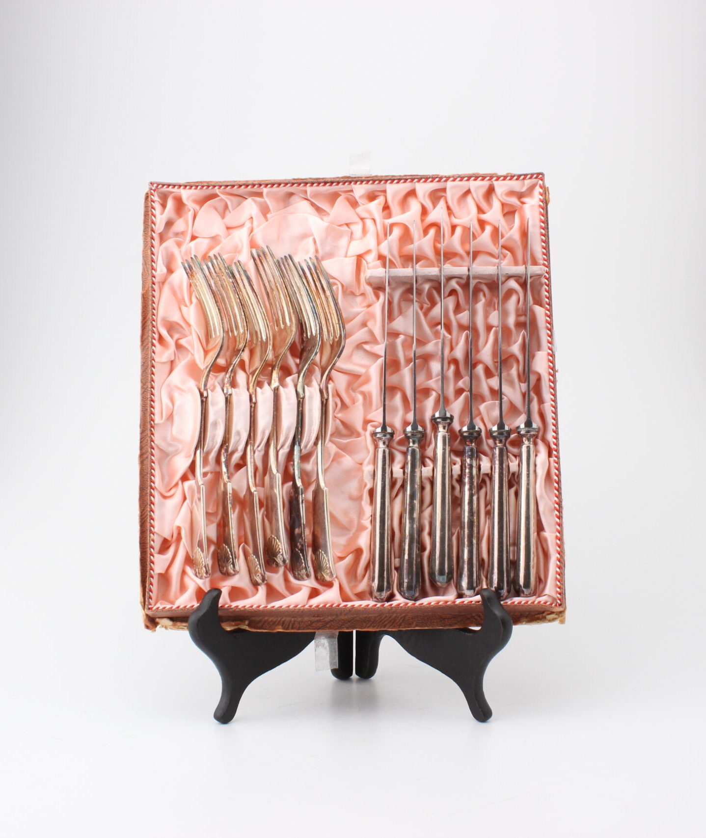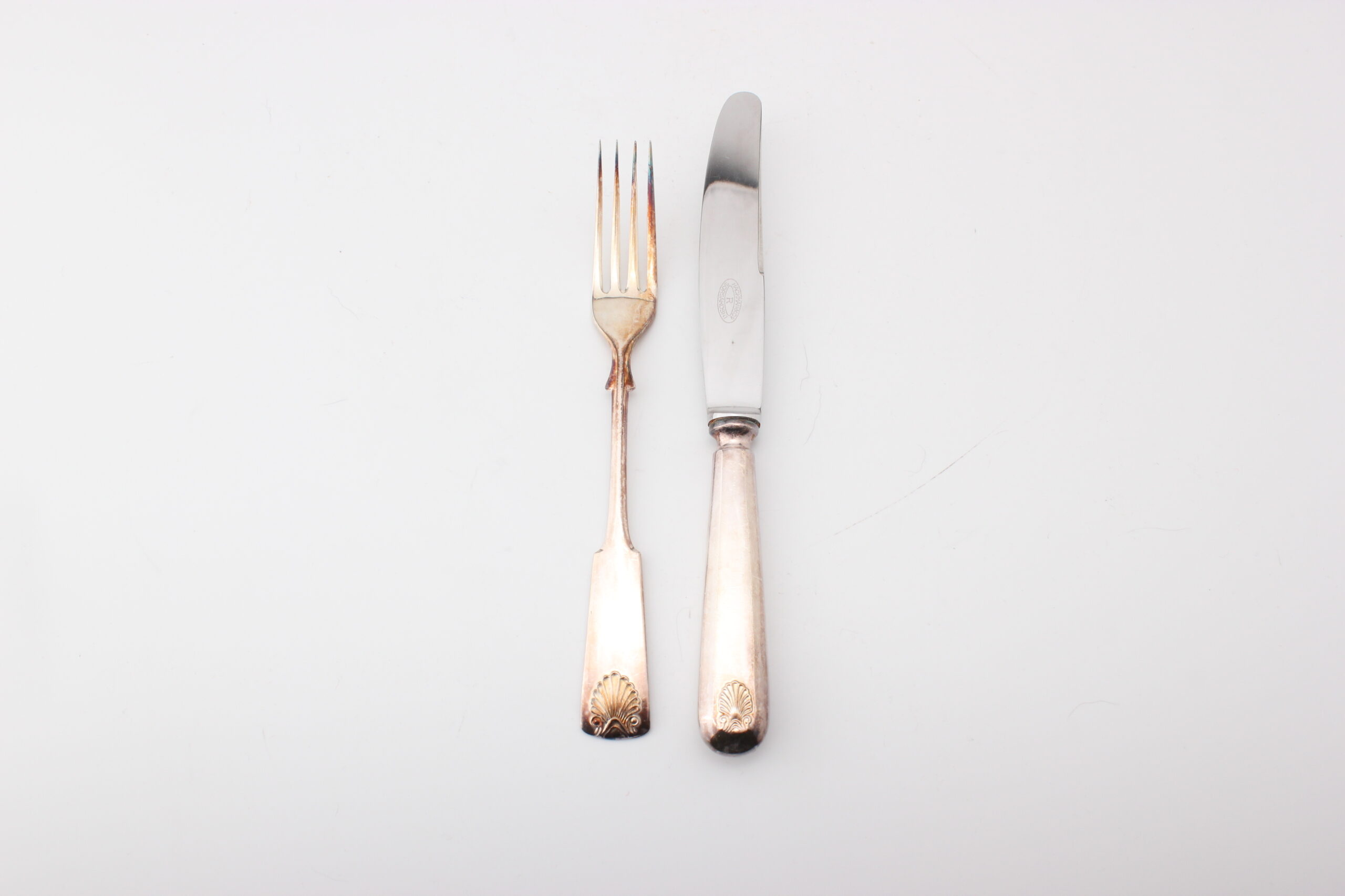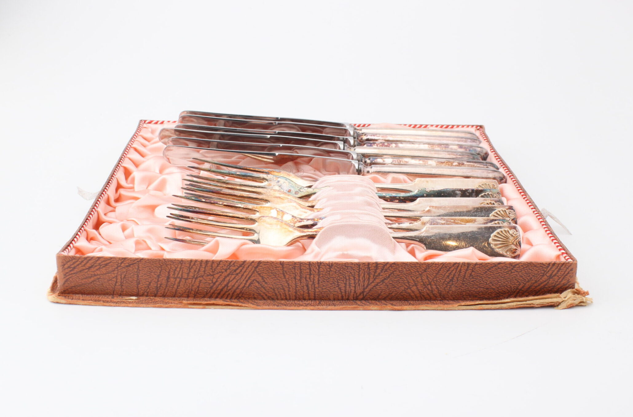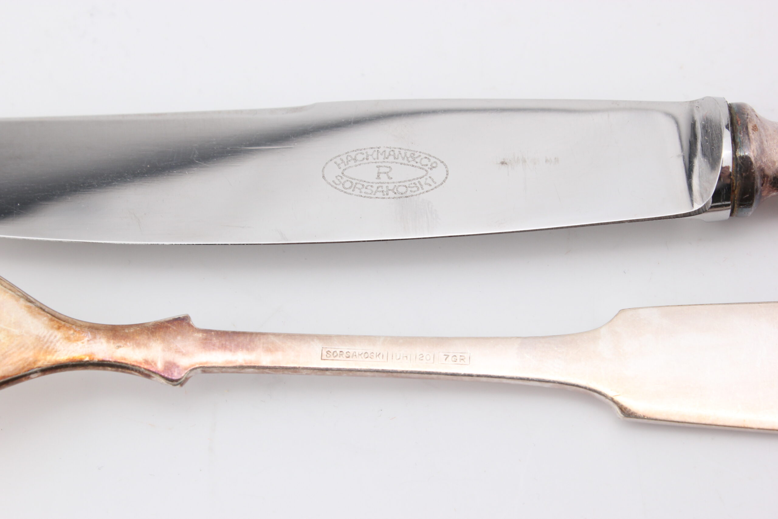 Sorsakosken hopeoidut aterimet. Setissä kuusi haarukkaa ja kuusi veistä.