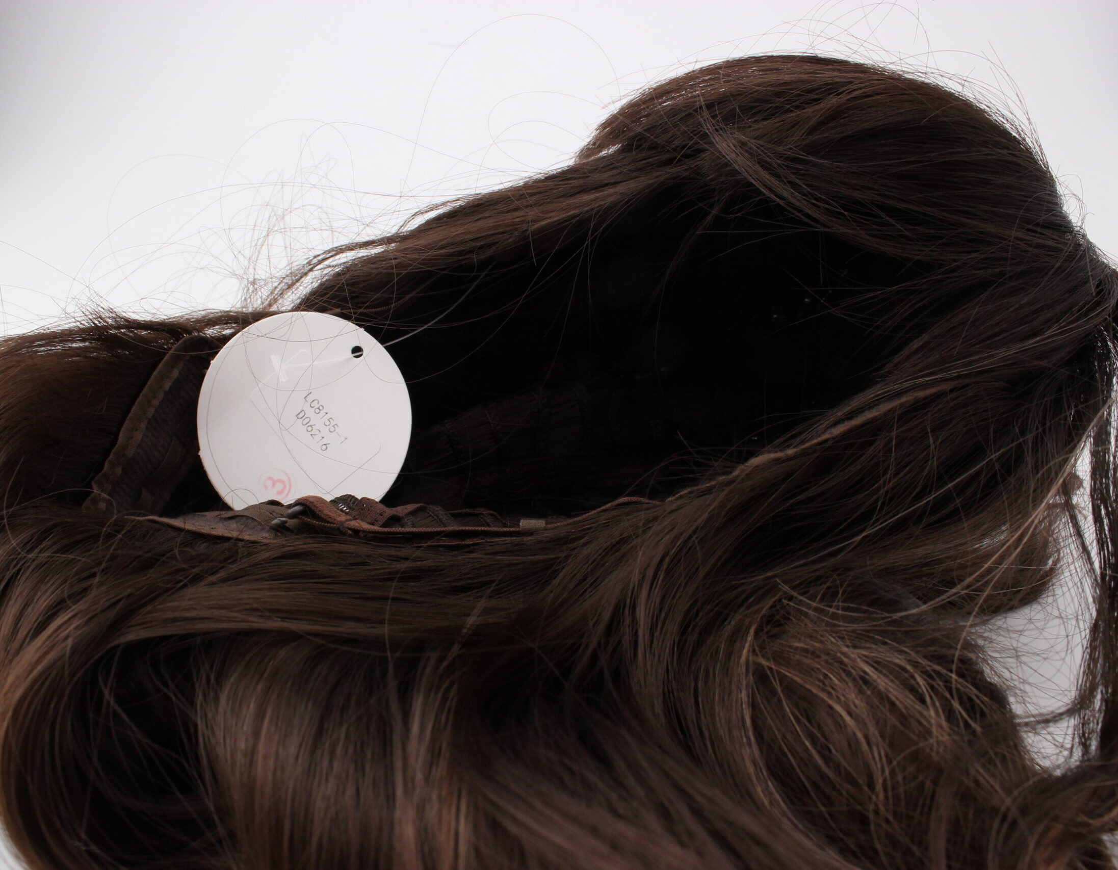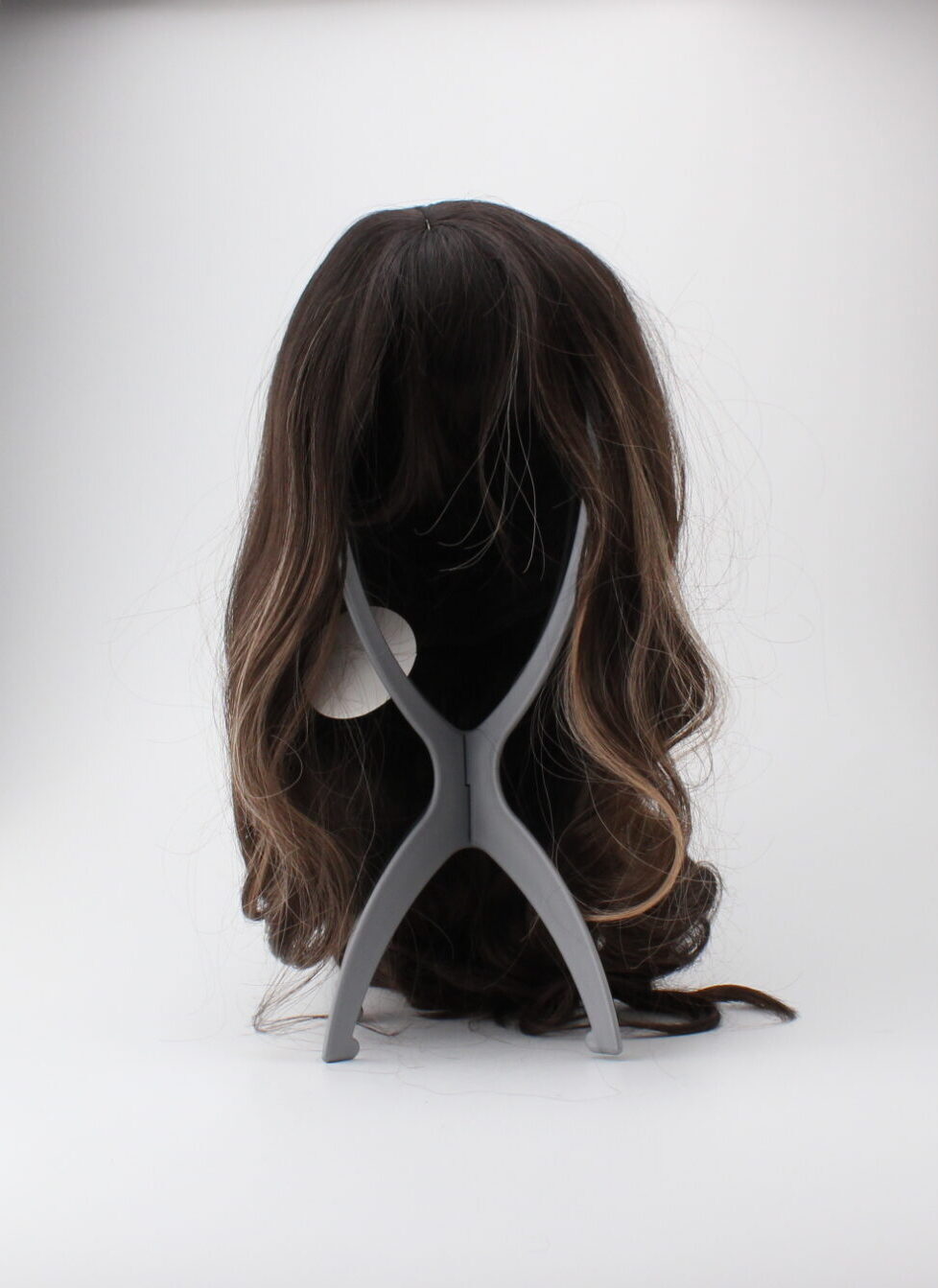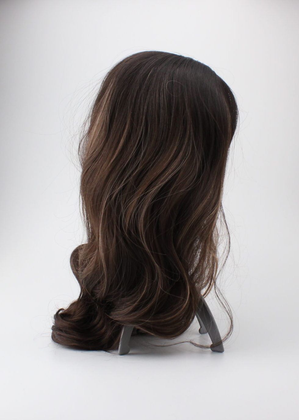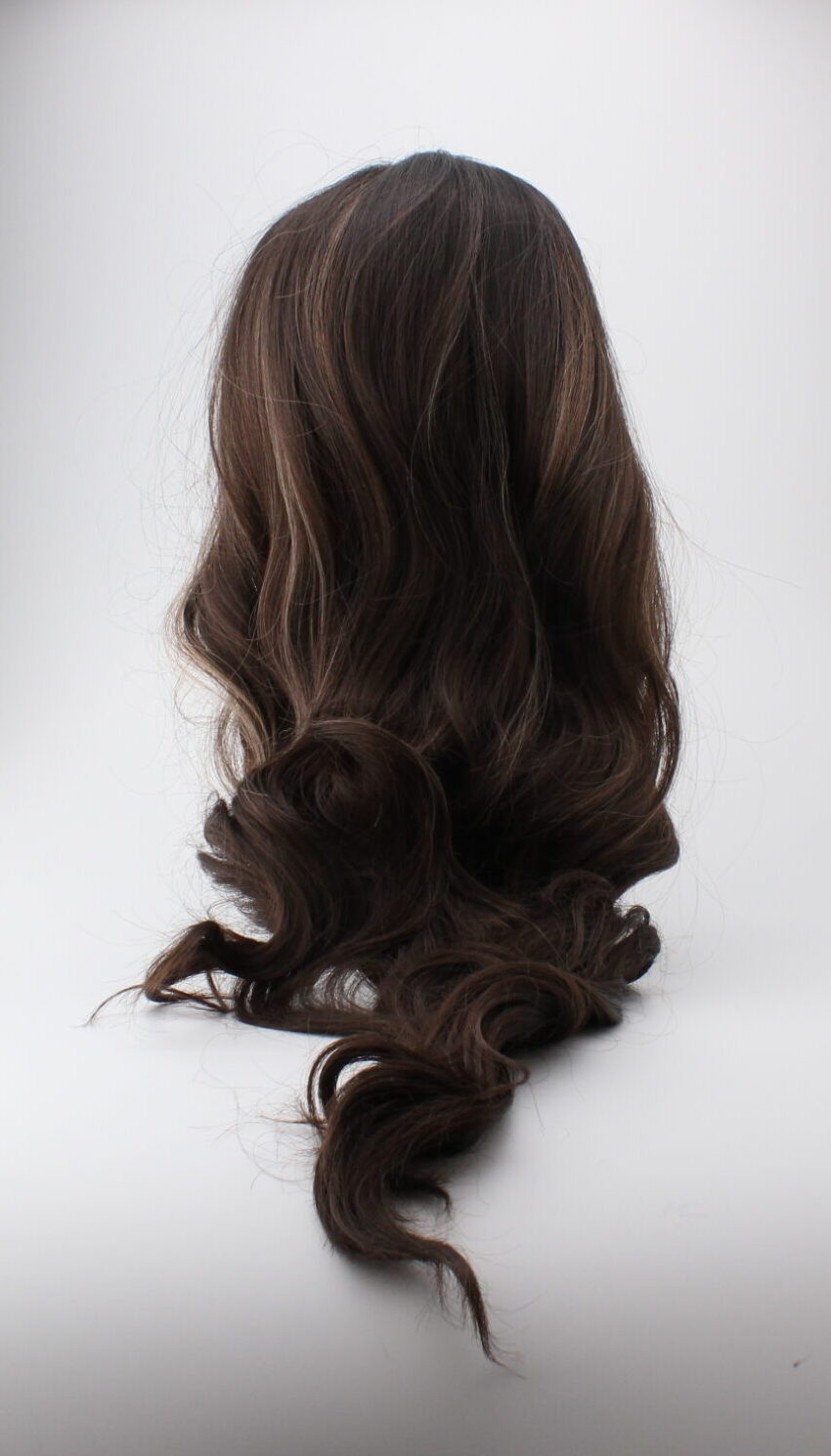 Kaunis tummanruskea pitkä peruukki jossa etuhiukset ja vaaleamman ruskeita raitoja. Peruukin koko on nauhoilla säädettävissä oikean kokoiseksi.