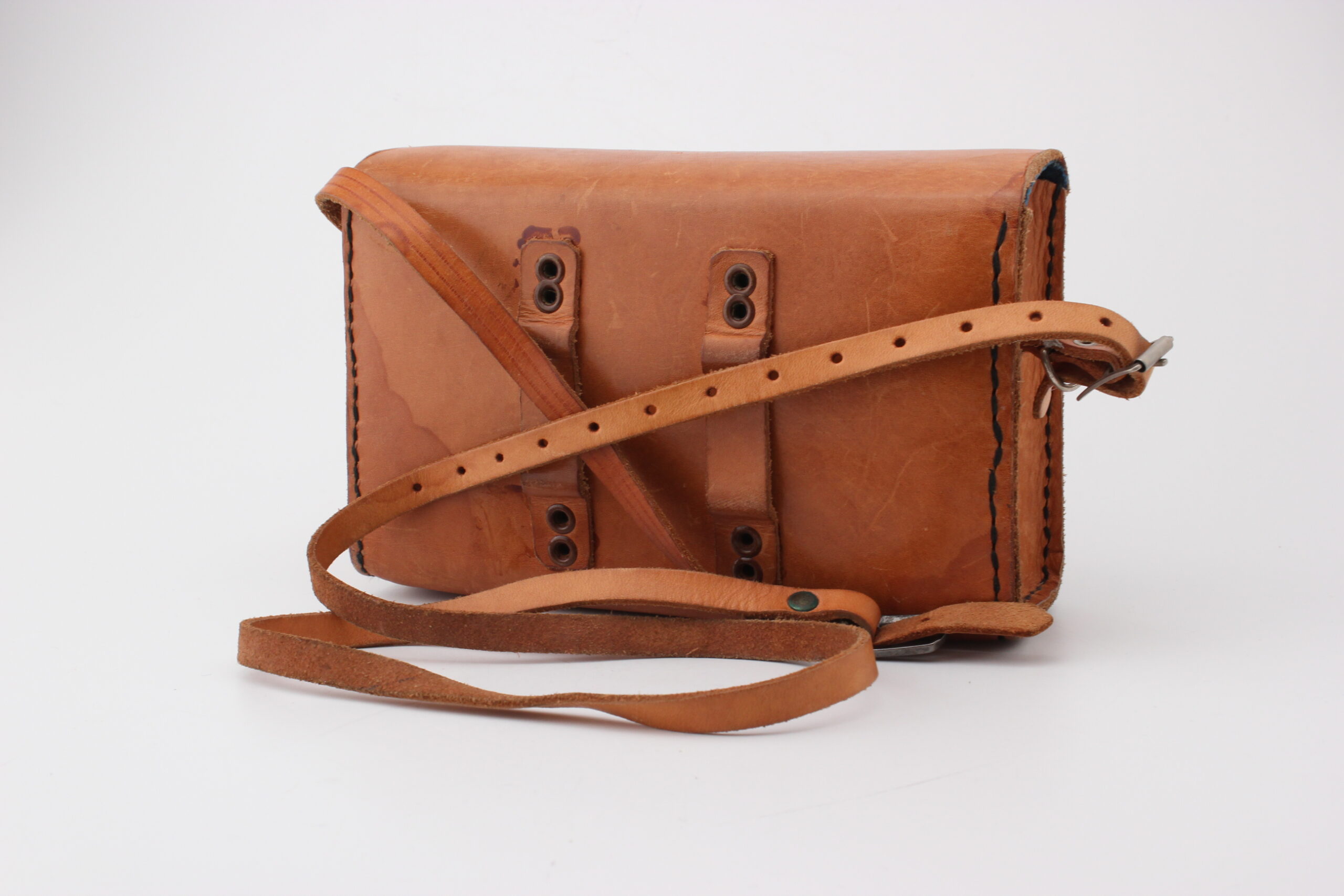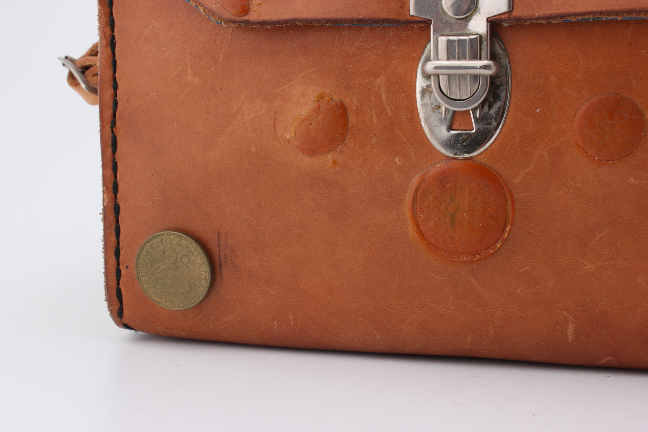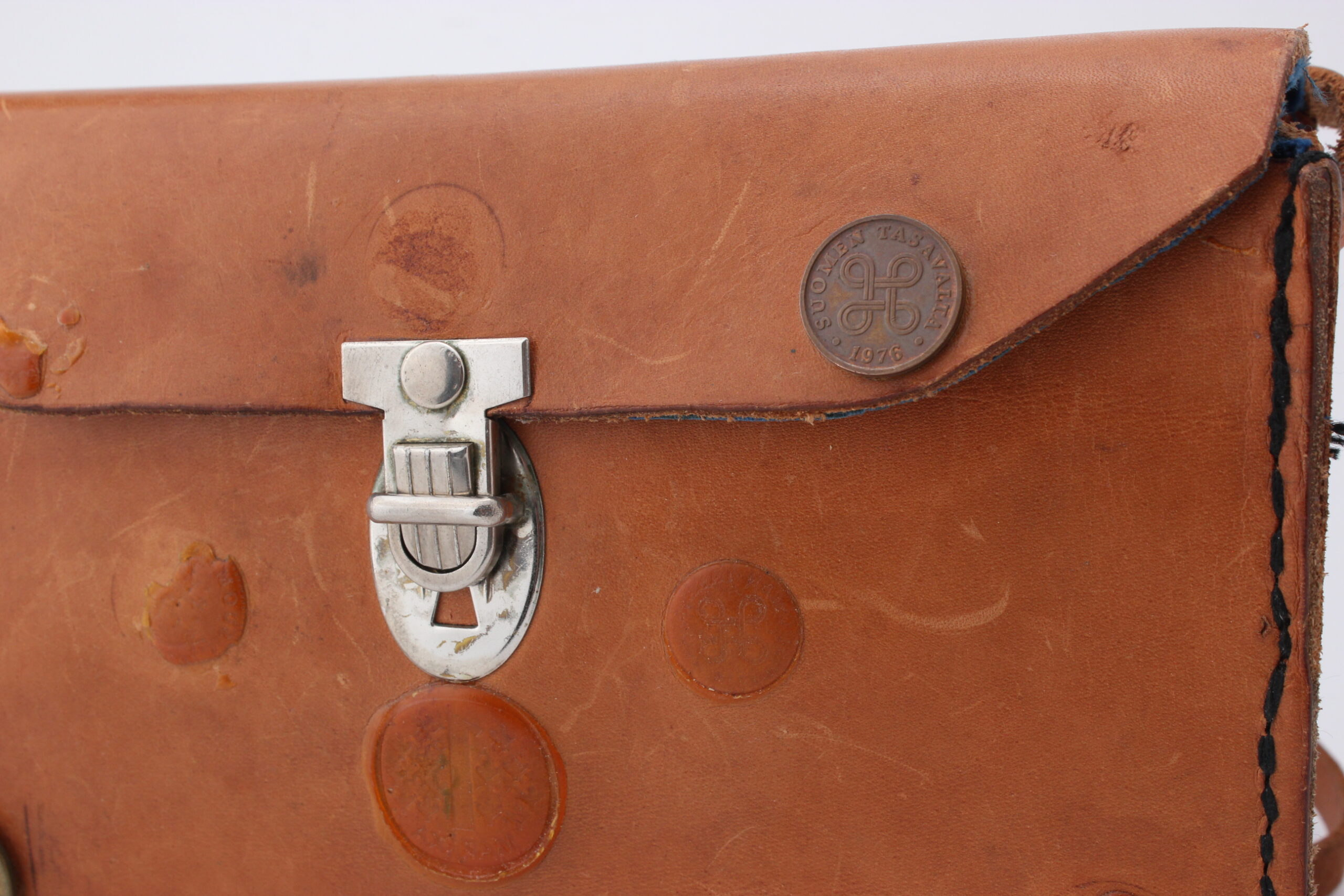 Kunto: ulkoisesti ehjä, naarmuja, liimajälkiä, käytön jälkiä, laukun pintaan liimattu kolikoita joista osa irronnut